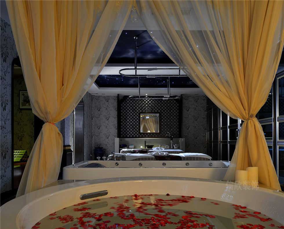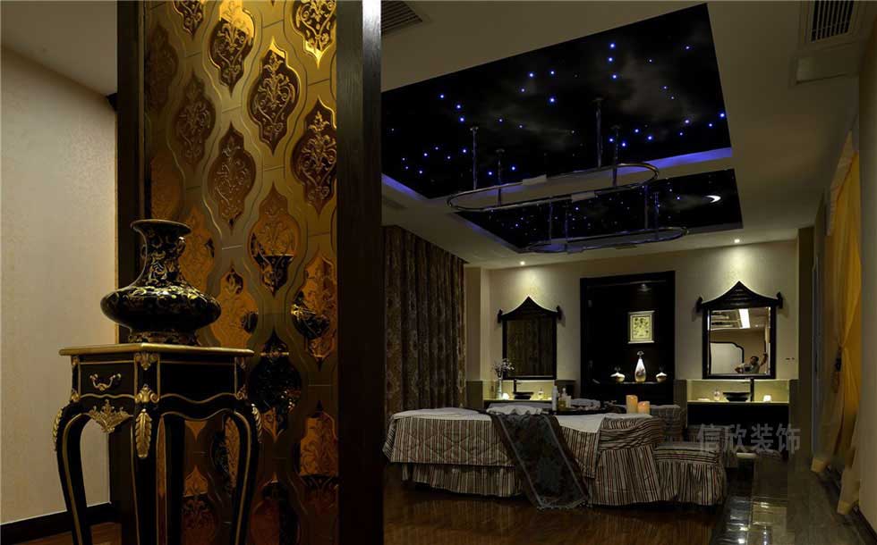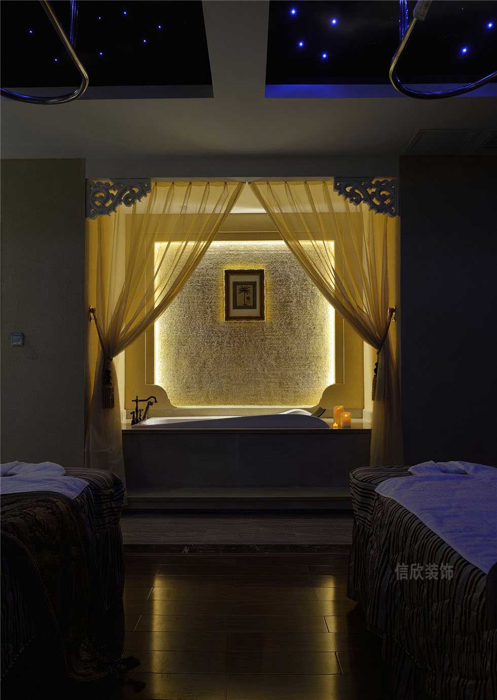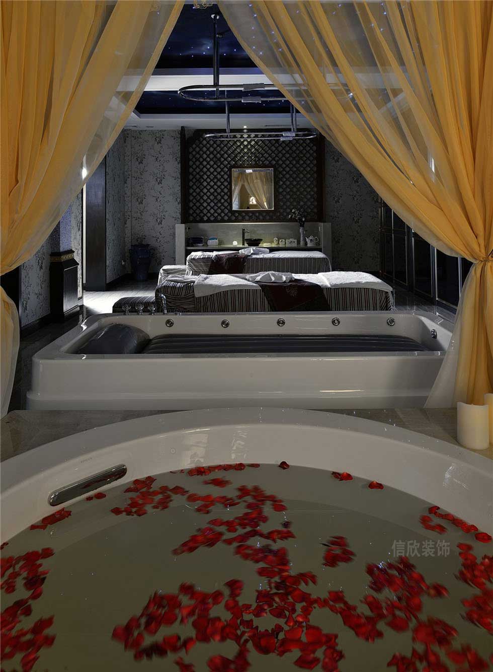 通過光影效果的變化,讓整個房間的燈光略顯昏暗,同時也更具溫馨之感,室內窗簾的應用把沐浴間和按摩間,不經意間做了功能性區分,星空頂讓人一抬頭就能看見繁星點點,給人無限遐想。