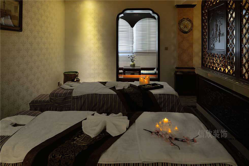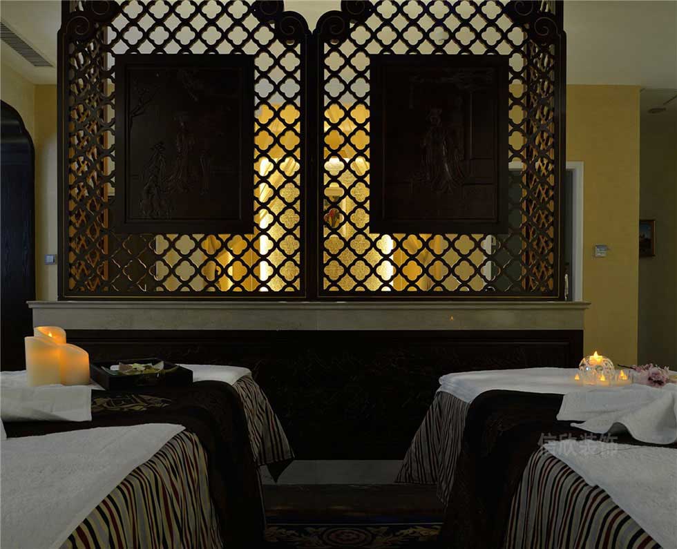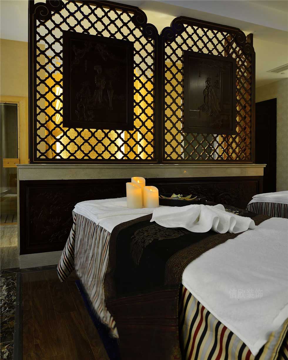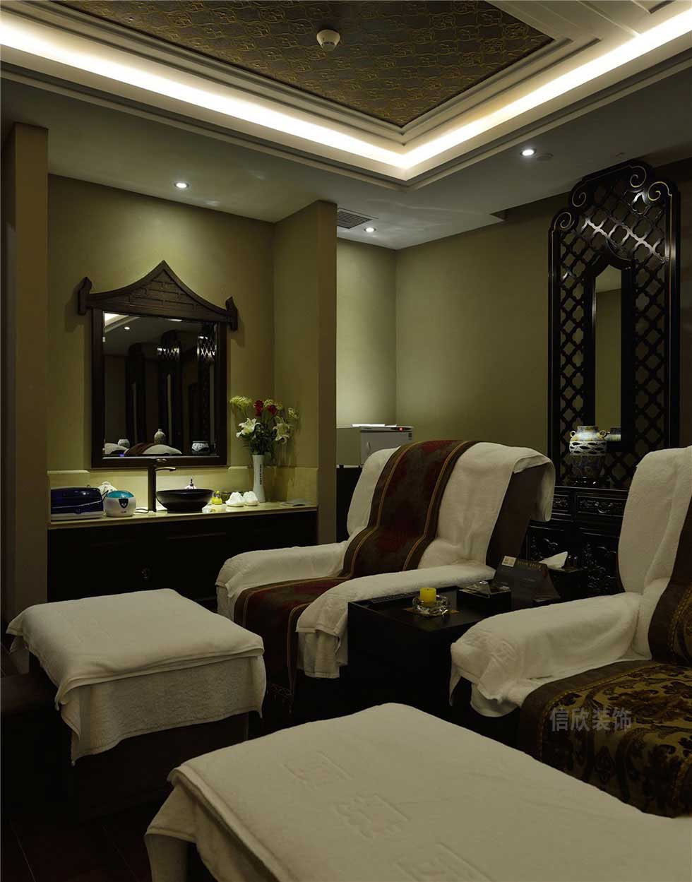 美容養生會所門面的設計,采用古典中式風情的格調,三門式開門方式,輔以大面積中式元素的回字形雕花隔斷,燈箱的照射下筆意雄渾的書法招牌,中華五千年歷史的深厚積淀和文化底蘊;滄海桑田一幕幕濃縮在這一副美妙的古畫意境里。