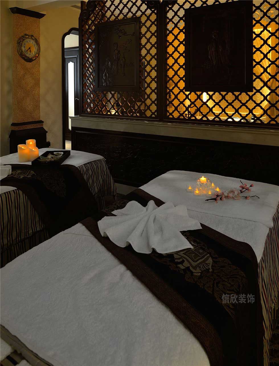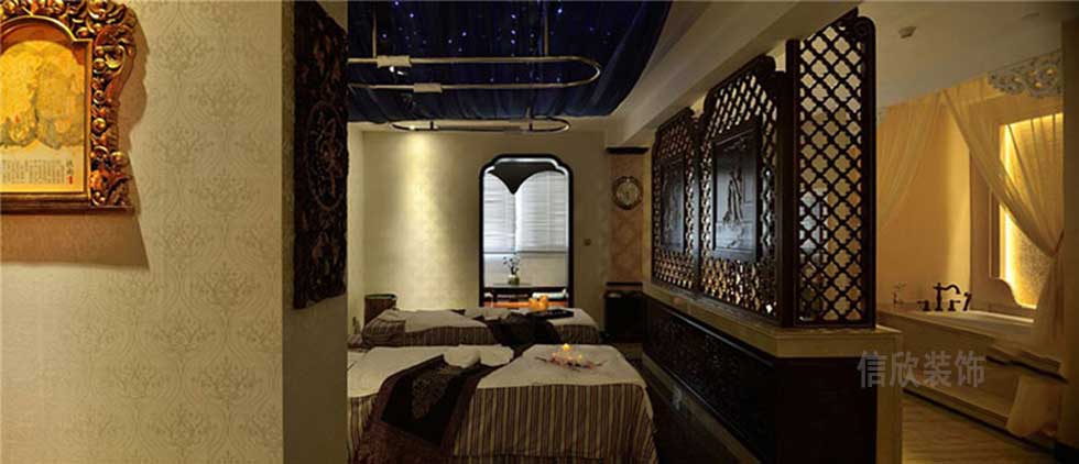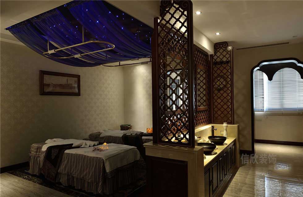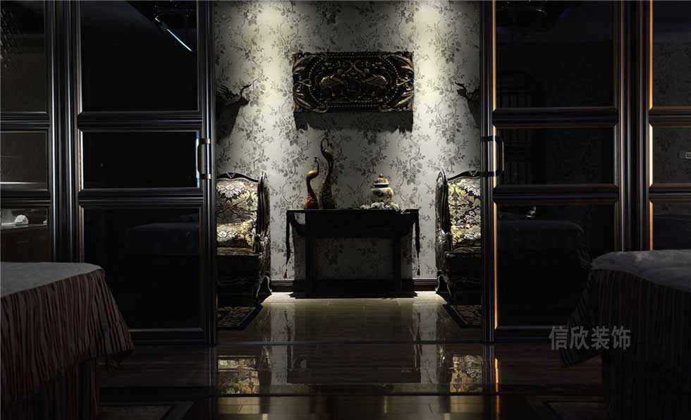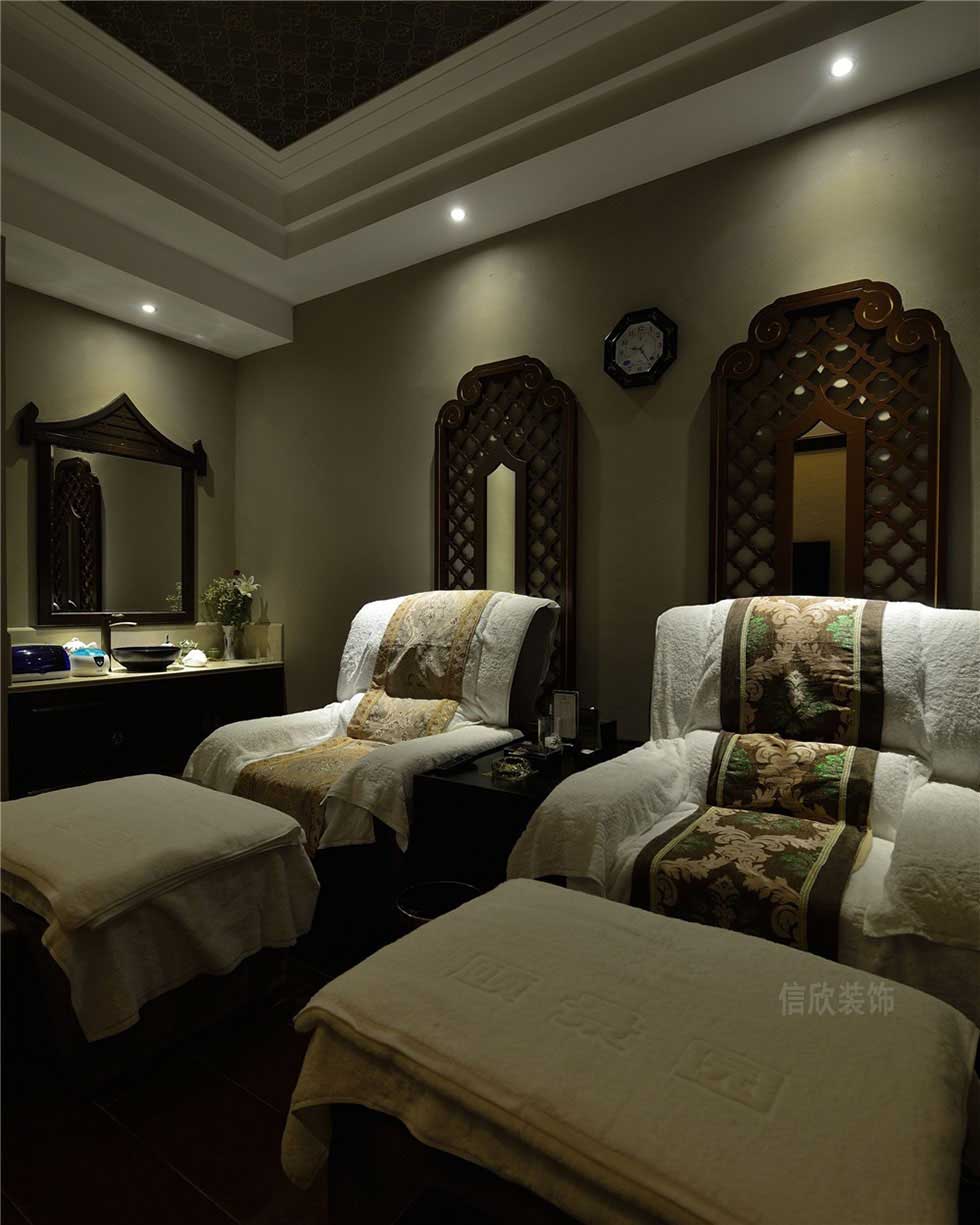 美容養生會所門面的設計,采用古典中式風情的格調,三門式開門方式,輔以大面積中式元素的回字形雕花隔斷,燈箱的照射下筆意雄渾的書法招牌,中華五千年歷史的深厚積淀和文化底蘊;滄海桑田一幕幕濃縮在這一副美妙的古畫意境里。