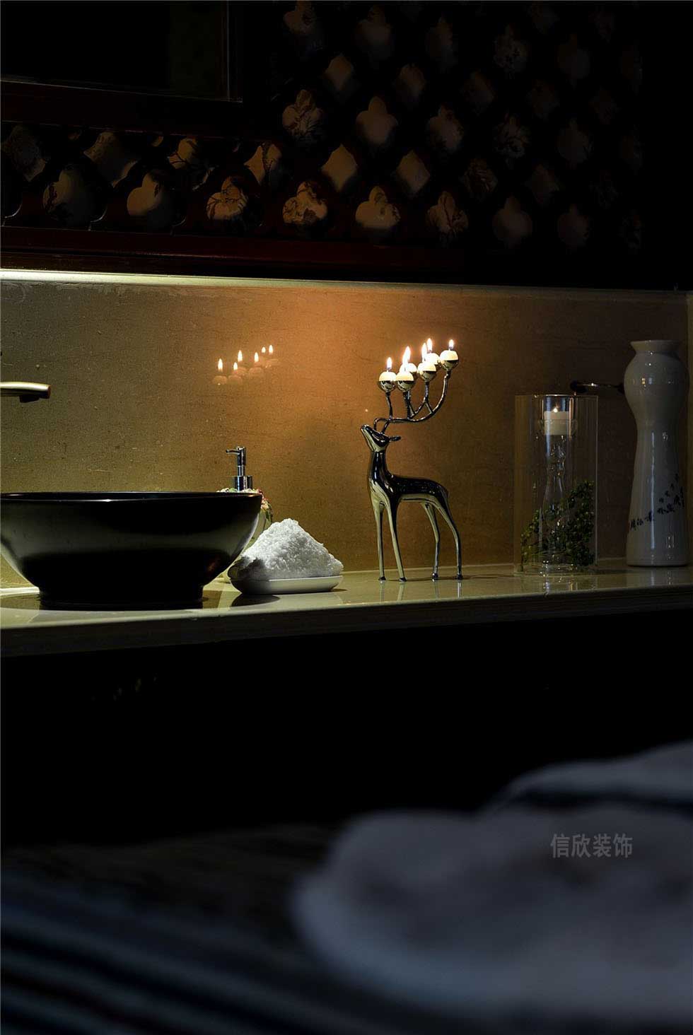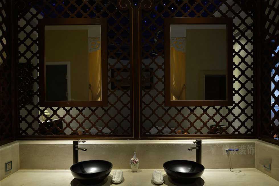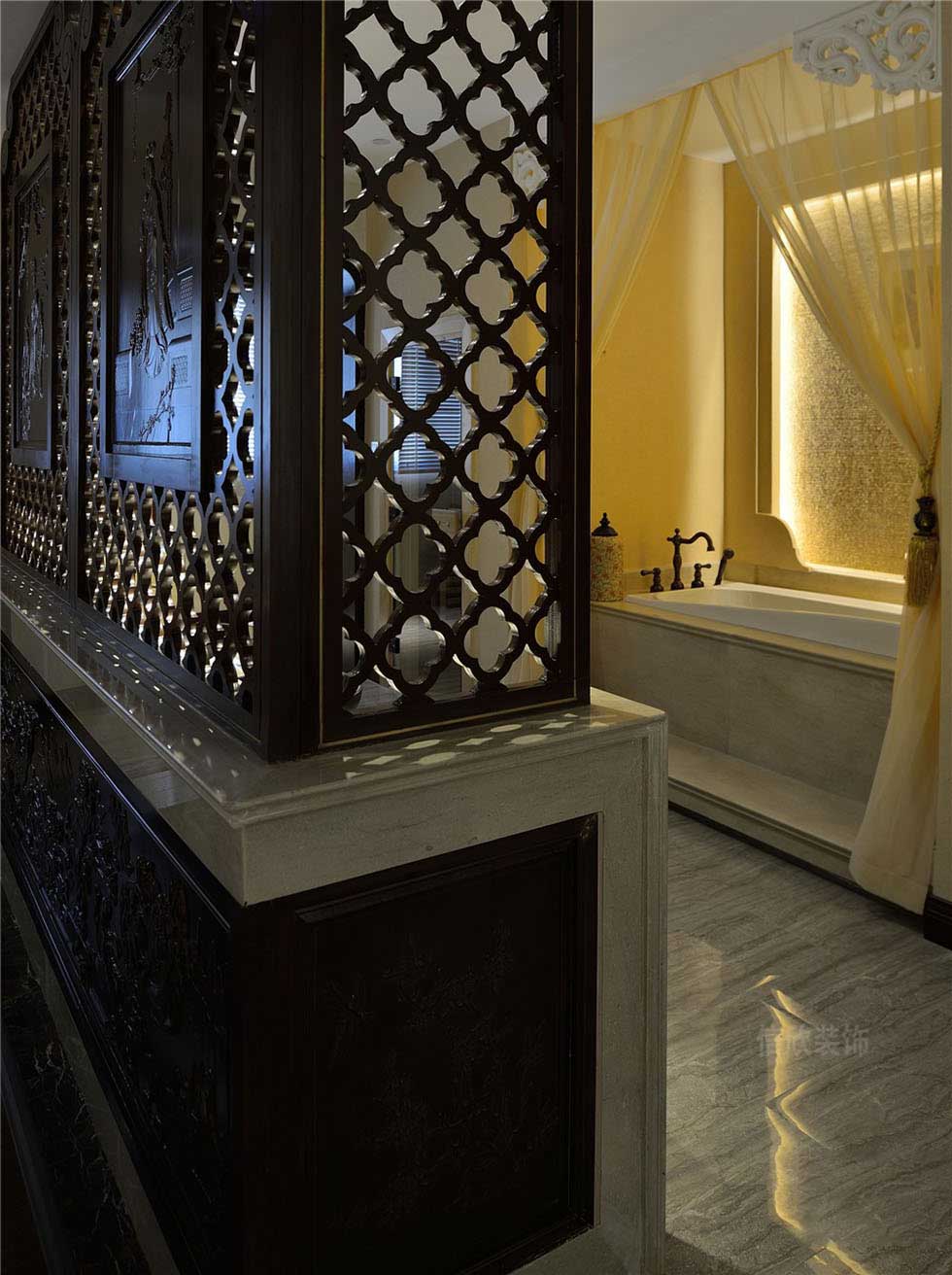 半開放式的隔斷,完美的隔開了按摩區和沐浴區,美觀的同時達成了功能區分隔的作用,在隔斷下面做洗手盆,既有裝飾的效果,又能藏瑕讓一切看起來更連貫和美觀。