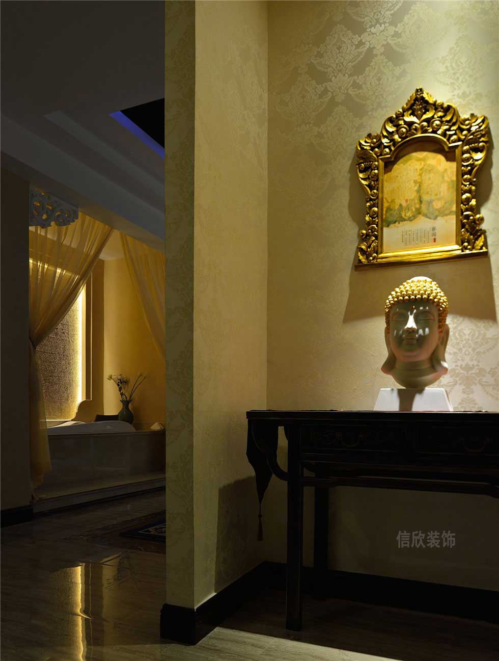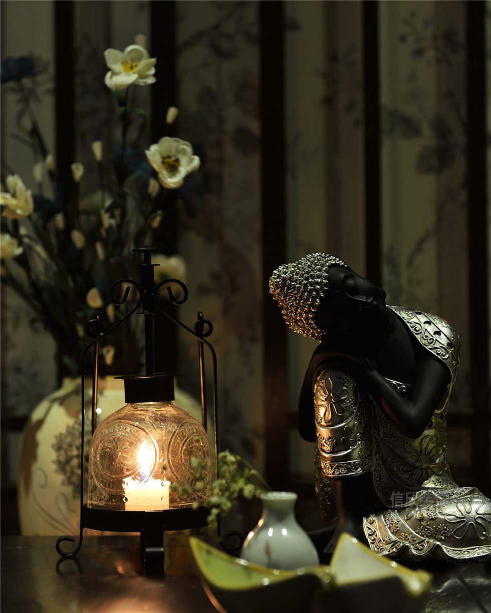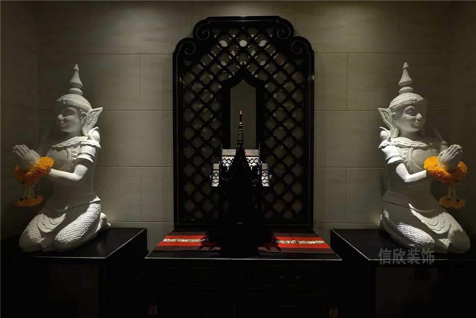 過道加入泰式佛龕柜和佛像的設計,豐富了元素的多樣性,也讓整體看起來更飽滿,多元文化搭配和拼接的表達方式,讓整個更添加了一份超然物外的禪趣。