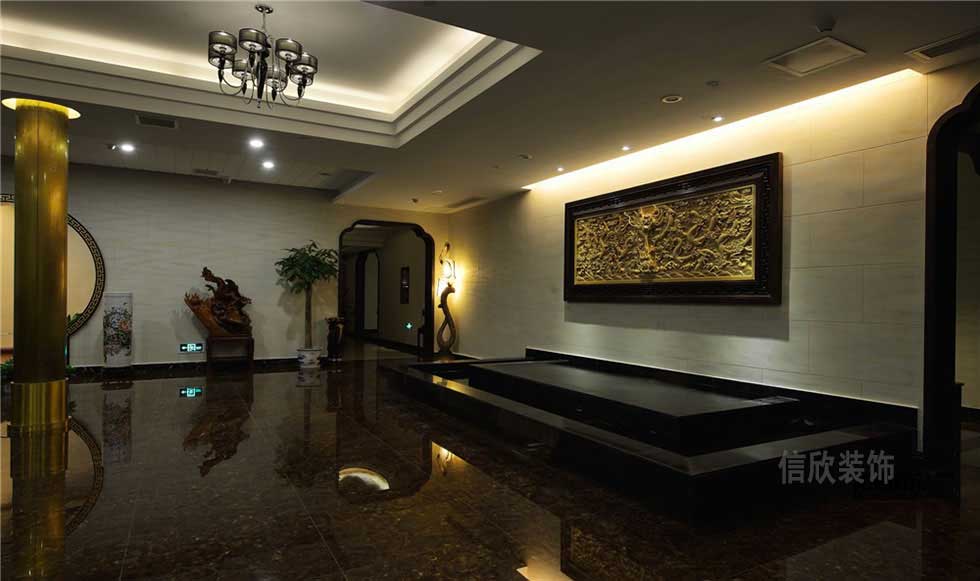 大廳的整體看上去,東西開闊,南北通透,九龍壁和黑色水池的應用,把古典皇家御用元素,淋漓盡致的展現在世人面前,渾厚的文化底蘊,宮殿般的設計,讓人印象深刻,流連忘返。