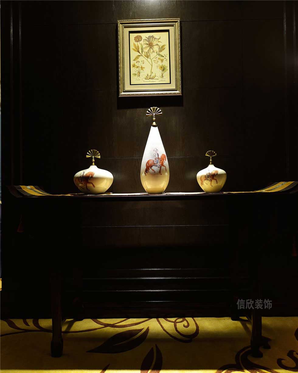 大廳休息區,采用八卦頂的設計,線條立體,層次分明,同時把博古柜,抽屜柜和洛可可風格的桌椅元素結合在一起,真正做到同時擁有中式的古樸,又擁有西式的情調。