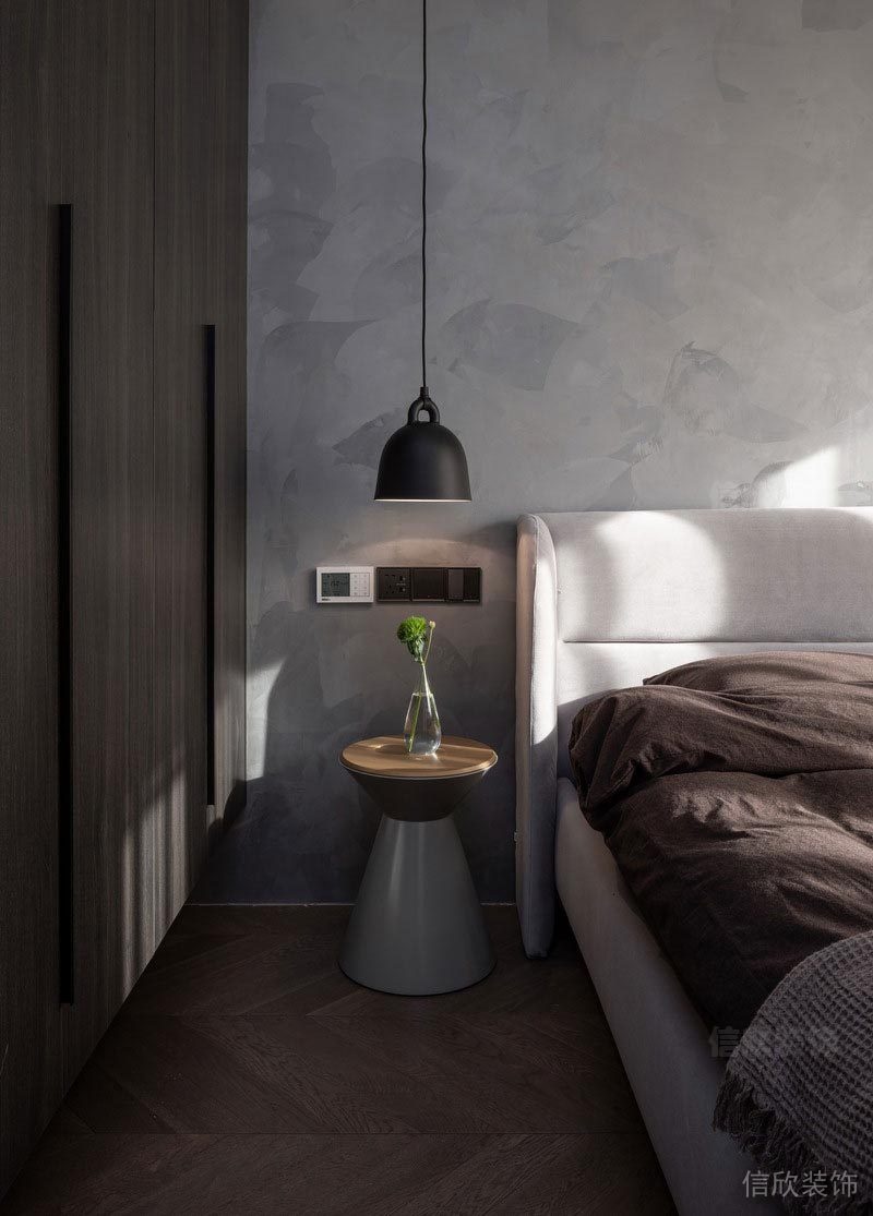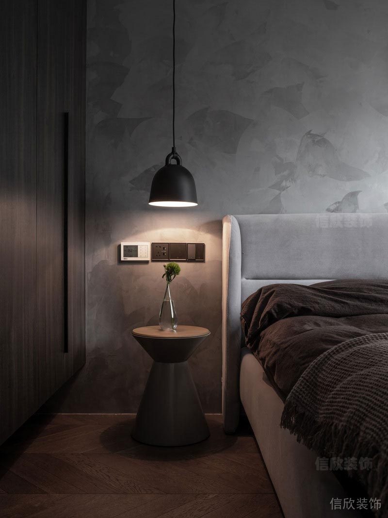 深圳市南山區雙子灣主臥 案主睡眠質量不好,所以搭配了深色的床品及窗簾,為了讓人進入主臥后能夠很快的放松精神有助于入睡。
