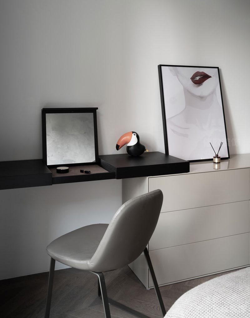 床尾斗柜和梳妝臺的組合滿足了女主人日常整理和梳妝的訴求,折疊式的鏡面小機關可以收納日常口紅及飾品。