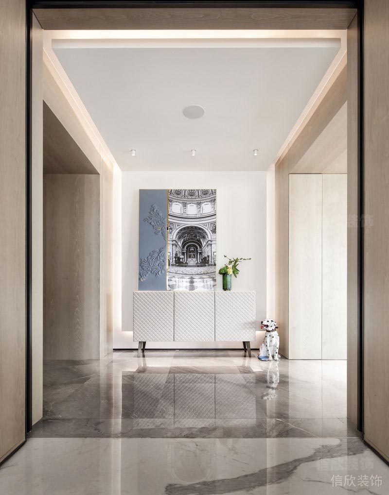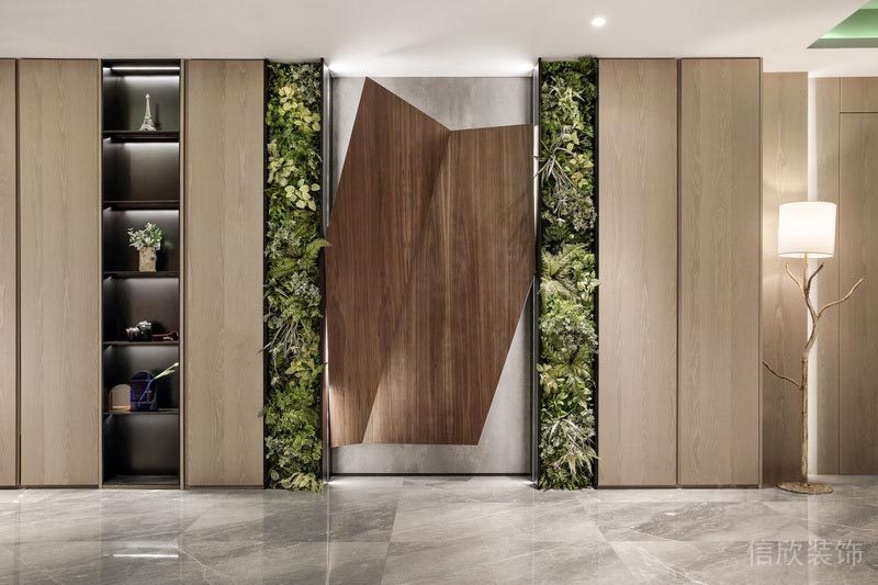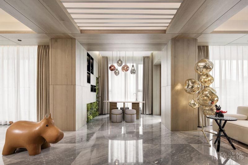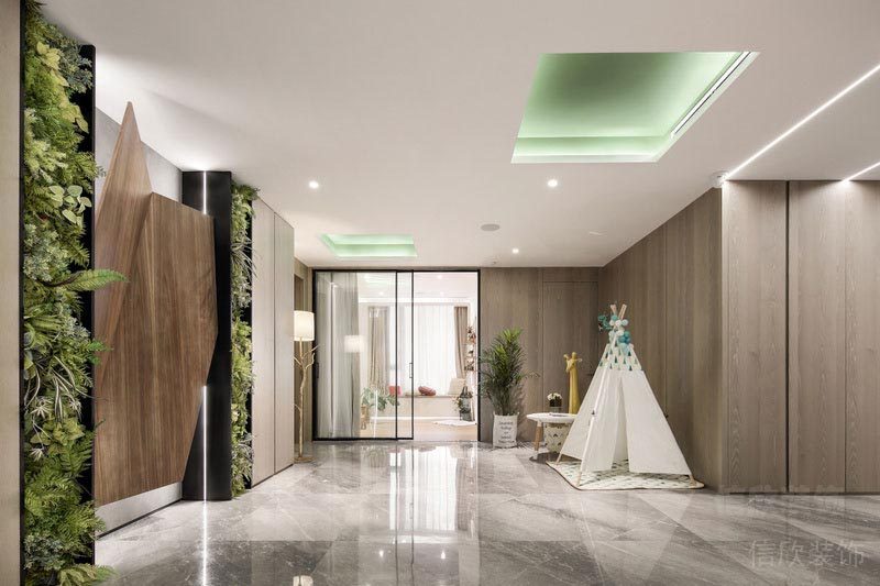 步入入戶,真個灰色系構成的地面,原木格柵頂的造型,明亮寬敞的大廳,讓人感覺奢華和貴氣撲面而來。