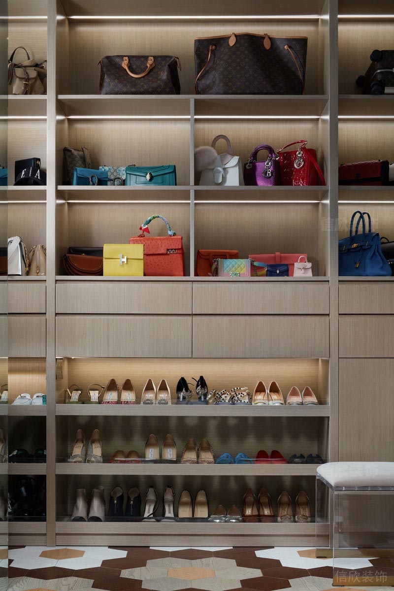 原木色的衣柜,配黑色的茶色玻璃,寬敞的衣帽間,是每一個精致生活的女人,必備之選。