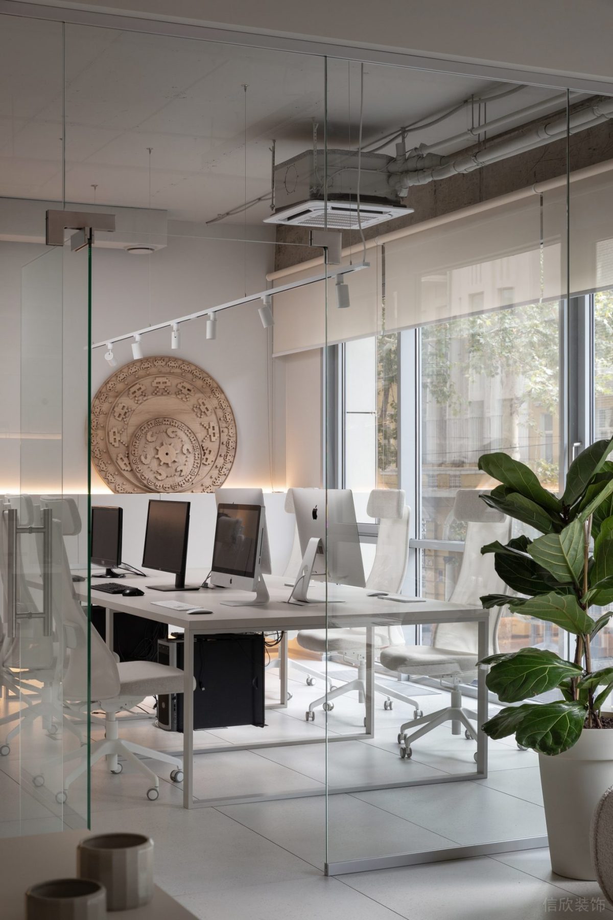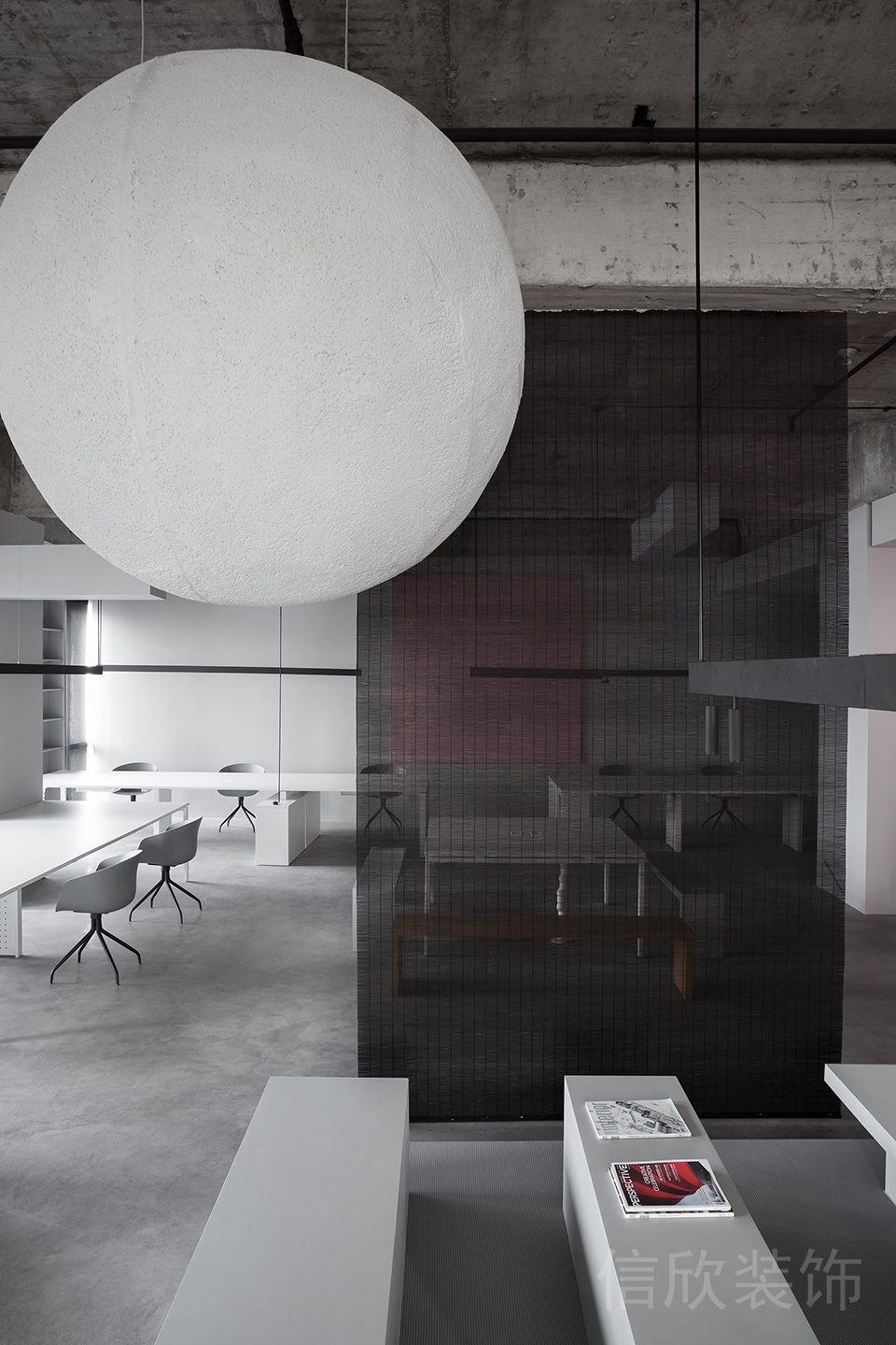 空間北部則是簡潔的辦公區(qū)和會客茶室,功能化的設(shè)備,隱藏繁瑣的線條,設(shè)備掛件,讓整潔的辦公環(huán)境給人清晰的邏輯和輕松的氛圍。部分的暖色配置,削減黑白的冷硬,提點人內(nèi)心的溫度??臻g中的每一樣器物都來自于設(shè)計者的精心挑選,設(shè)計的美體現(xiàn)在物的形態(tài)與功能之中,生活中的器物,傳遞著人對生活的熱愛,所以它們歸屬于這個空間,又不僅僅只屬于這個空間;他們在歸屬于生活,又不僅僅只用于生活……站在藝術(shù)的角度,器物不只是器物,裝修設(shè)計也不只是設(shè)計。
