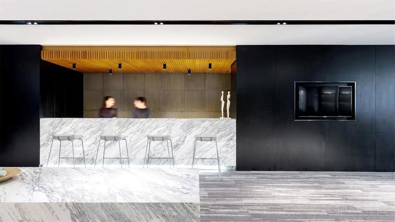 深圳市南山區辦公室吧臺 石材的冷艷和木藝格柵頂相結合,體現出一種簡約的雅致,工作之余,坐下來喝杯飲料,靜靜思考人生意義,自帶一份灑脫的氣質。