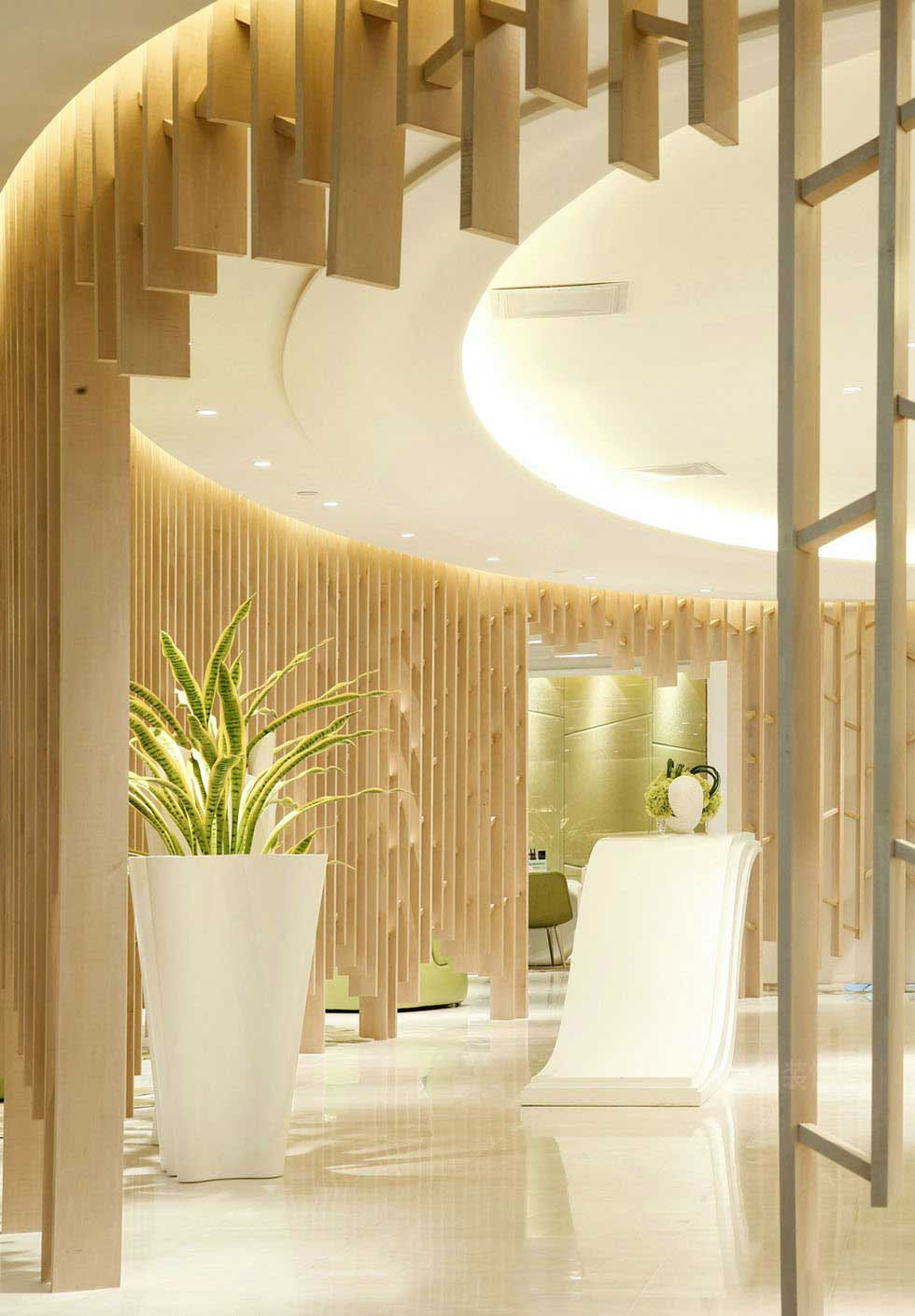 設計理念:隨著健康、原生態的概念越來越受城市人青睞,把原生態概念滲透到美容辦公的體驗中心去。木條子高低錯落,宛如樹的枝葉垂吊在天花上。即為空間分割,也是空間造型與設計初衷的融合。搭配了嫩綠色的家具及植物紋理的地毯,使整個空間貫穿協調統一。