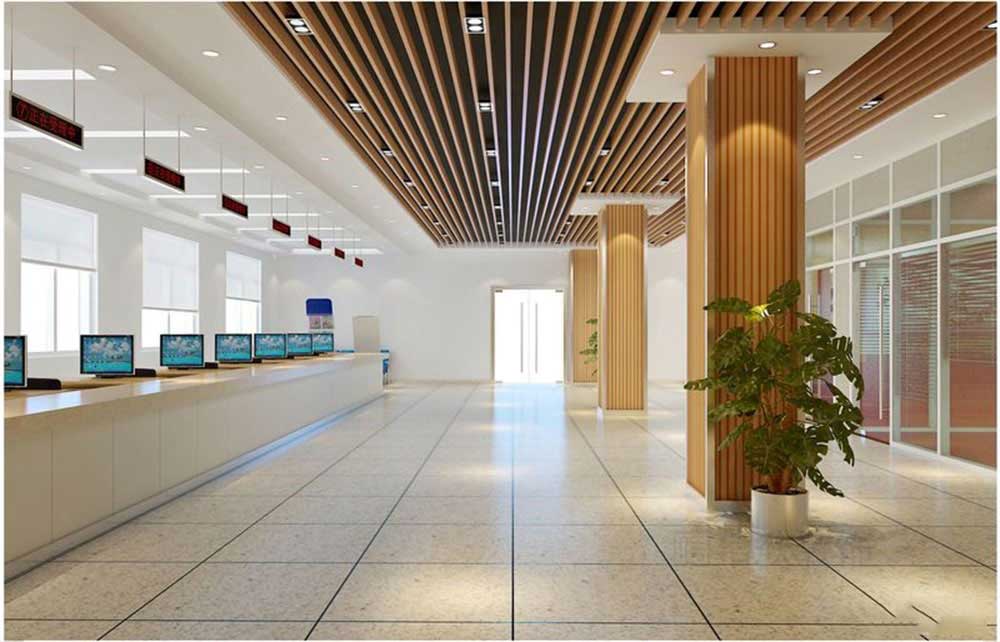 培訓基地辦公大廳的設計上,采取了仿古磚的地面,經久耐用,不容易出現污漬,石膏板和木藝格柵頂的結合,現代而又充滿了時尚雅致的氣息。