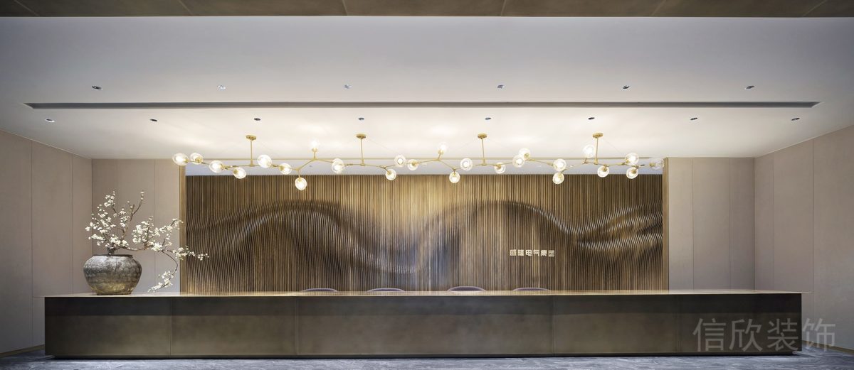 本次項目坐落于深圳市寶安區(qū)海秀路2021號榮超濱海大廈,是一個輕奢風格的辦公室裝修案例。空間里,傳統(tǒng)的辦公室布局模式被打破,取而代之的是開放、前衛(wèi)的輕奢風格和藝術(shù)空間環(huán)境,線性的刻板印象被曲線感取代。設(shè)計師希望在工作場所和人們之間建立新的聯(lián)系。并以裝置藝術(shù)的特點和空間的白化,自然形成圓形符號的收斂,以及曲線的延伸,創(chuàng)造出一個動態(tài)的、富有想象力的空間。步入展示中心的那一刻起,便會被接待前廳與眾不同的氣質(zhì)所吸引。輕奢主義接待大廳開啟了整個空間的未來主義感覺的第一幕,拋開了所有其他不相關(guān)的裝飾,賦予空間無限的想象力和最小的設(shè)計。只有通過對每一個細節(jié)的認真考慮才能實現(xiàn)這種克制和對空間的關(guān)注。 大理石地板與圓形的穹頂相對應(yīng),使人們仿佛置身天地之間,接待處的藍色水晶鐘擺宛如一顆行星在宇宙之間移動,前臺的每一面都有一套藝術(shù)裝置,表達人們對現(xiàn)在和未來的感知,使人遐想不已。