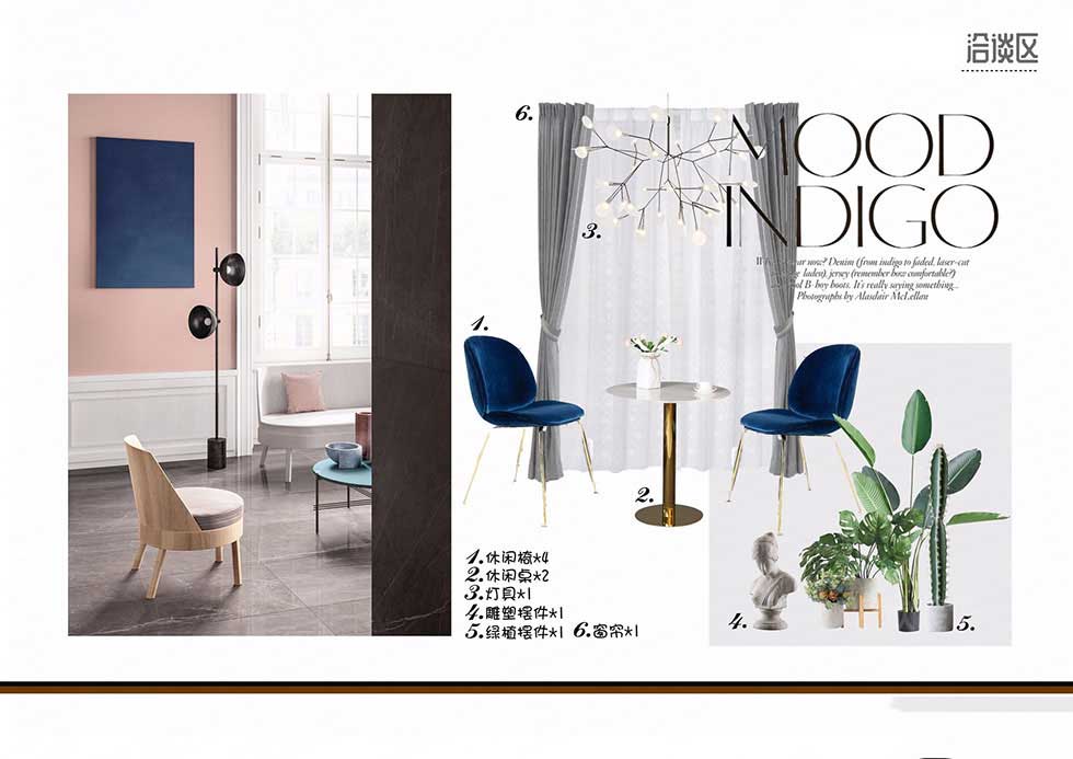 深寶藍(lán)色沙發(fā)搭配金屬座椅茶幾,同為金屬色的吊燈、壁掛框,充滿時尚又休閑的氣息。吹泡泡的赫本、粉色抱枕趣味橫生,讓人放松,等待的休息時間不再無聊。