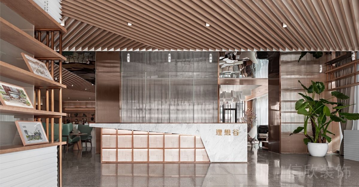 辦公室一層前廳長型懸浮裝飾柜的裝修中配置了暖色調的暗藏燈帶,展現出別致新穎的環境面貌。