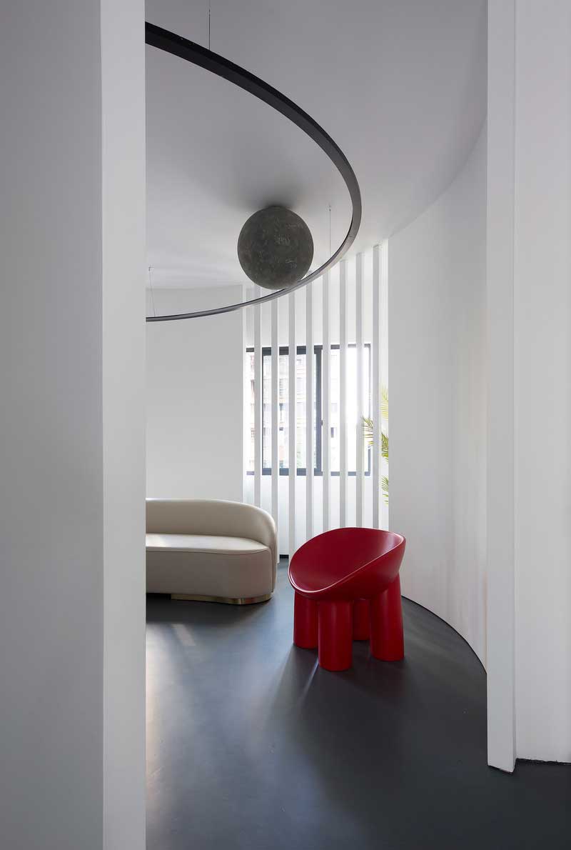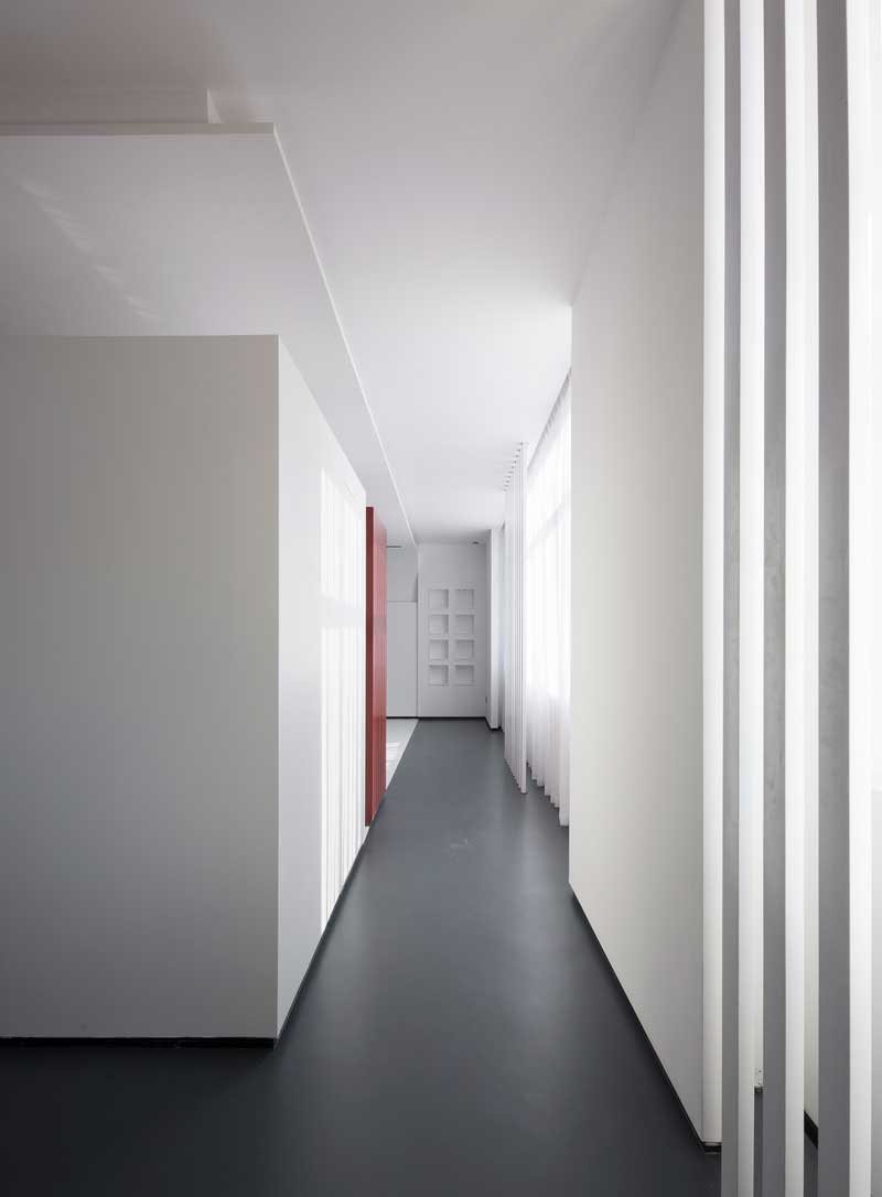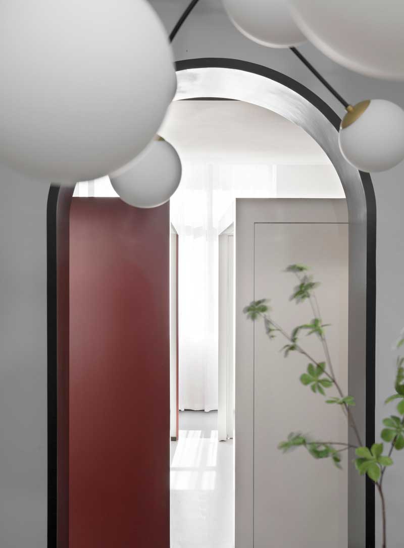 白色的墻面和強烈,給人的感覺整體通透而開闊,光線亮度高,空間給人的整體感覺,非常優雅而具有高級感,灰色的地面和紅色裝飾,讓整個充滿了一種簡單的高級氛圍。