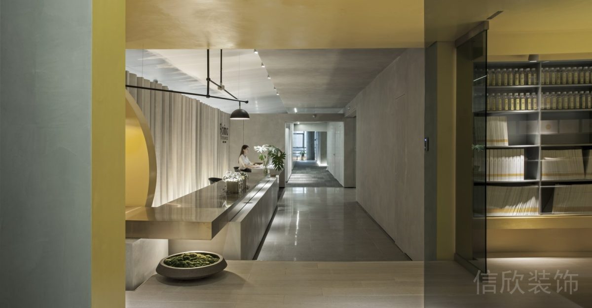 辦公區延續簡約風的設計理念,整個開闊明亮,光線飽和度高,空間延伸感強,白色素雅的空間,灰色水泥墻面,素雅的格調結合工業感的原始和粗獷,形成了強烈的材質對比特性。