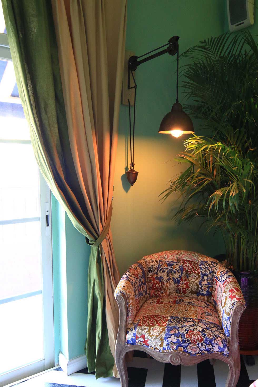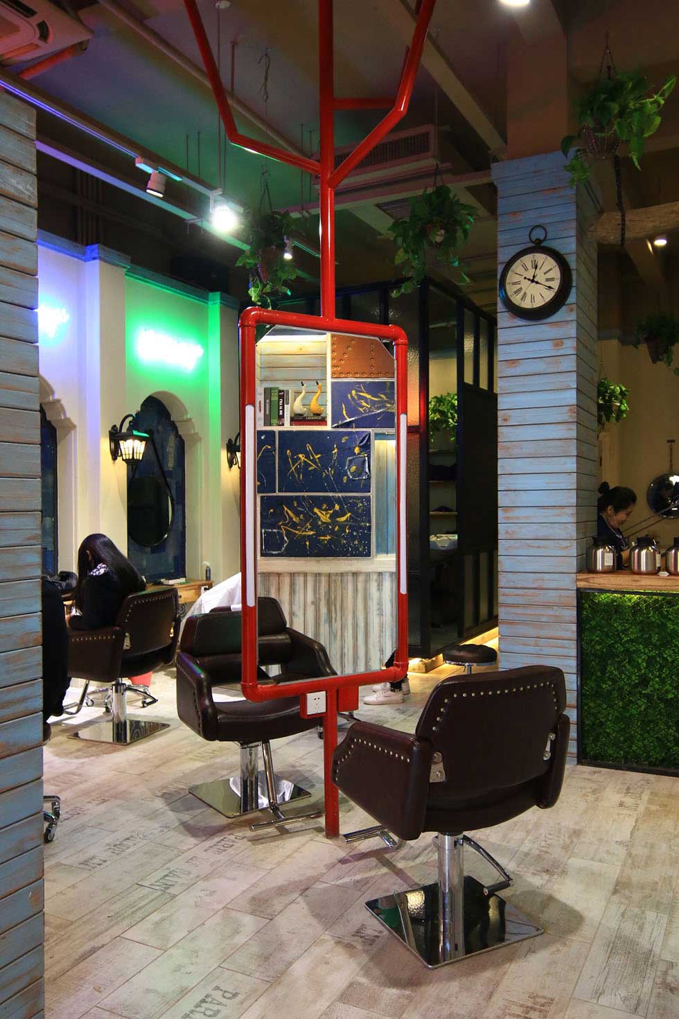 發(fā)型區(qū)的設(shè)計(jì),保留原有建筑的結(jié)構(gòu),通過(guò)鐵藝隔斷做了一個(gè)空間分隔,留有一個(gè)洗頭區(qū),是功能性更加合理,同時(shí)落地式的實(shí)木造型鏡子和北歐壁紙,則把整體效果渲染的緊湊而充滿藝術(shù)氣氛,和文藝青年喜歡的特質(zhì)。