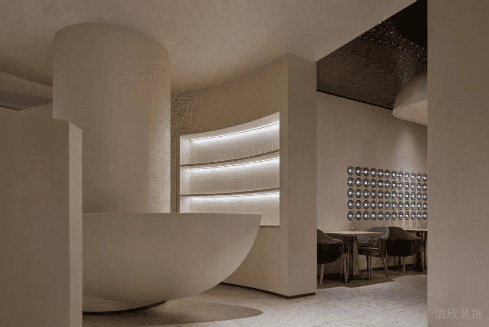 川菜餐廳圓弧形卡座的裝修設(shè)計(jì)是對(duì)包裹關(guān)系的隱喻,同時(shí)兼顧通透性與私密性。