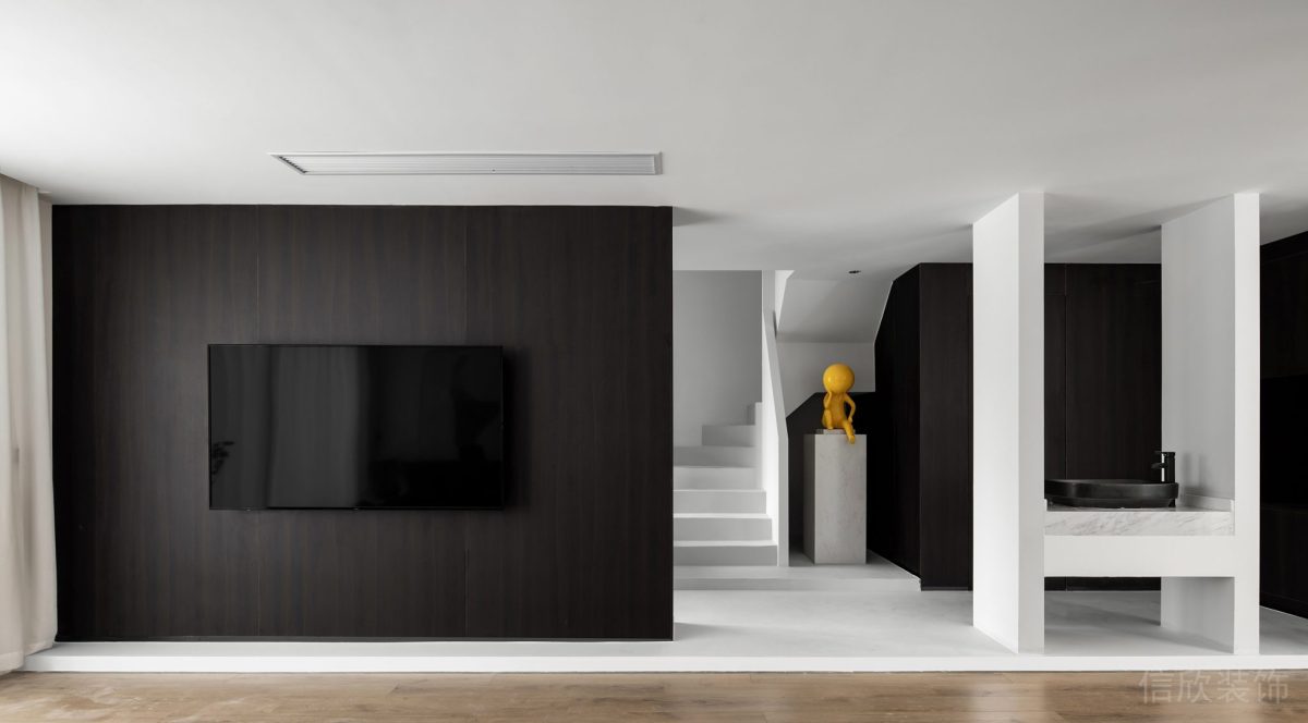 辦公室前廳服務(wù)臺背景墻的裝修醞釀出現(xiàn)代主義黑白灰色調(diào)空間設(shè)計的酷炫感。