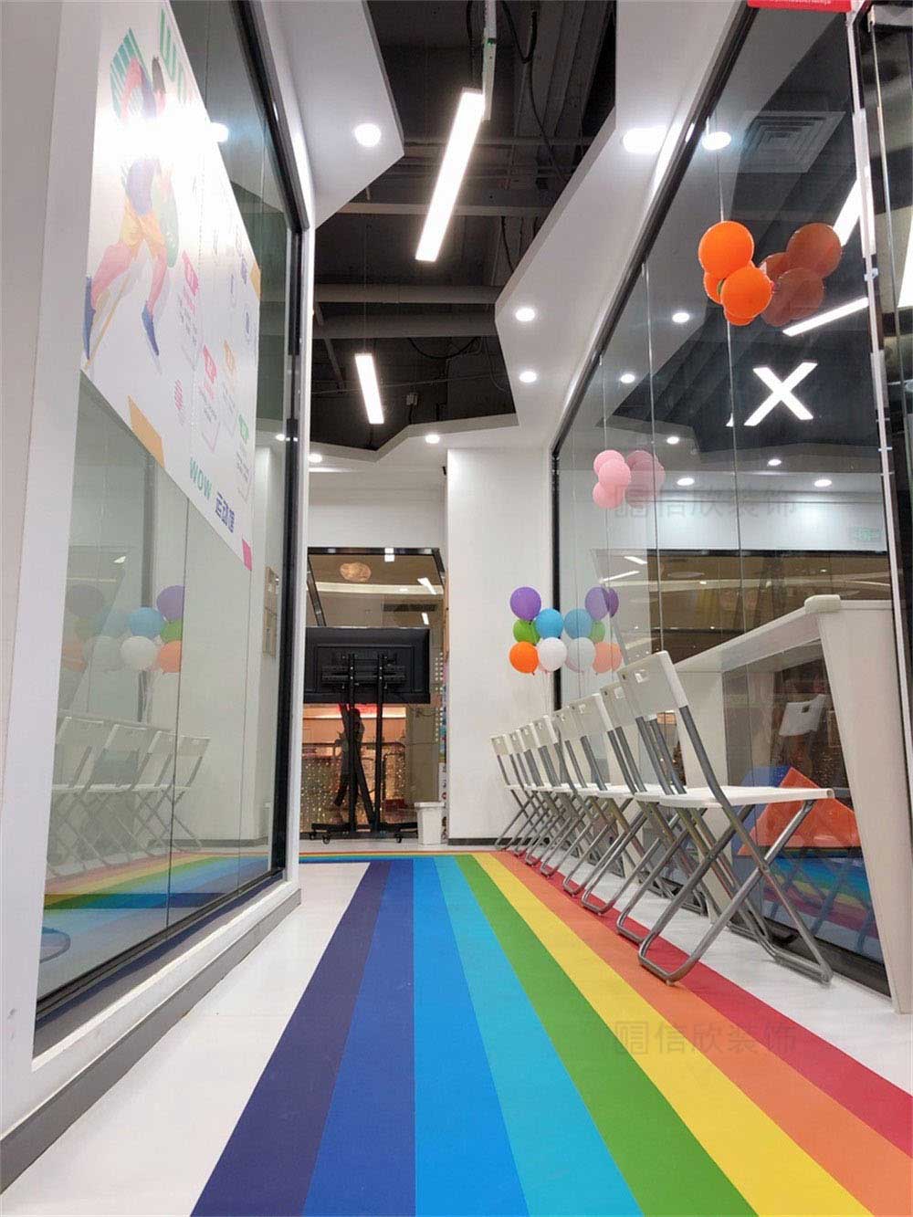 白色的前臺(tái)和背景墻,黃色立體圖形的加入,看起來(lái)簡(jiǎn)單干凈有醒目,加上七色彩虹的地面,符合孩子天真純潔的特點(diǎn)。