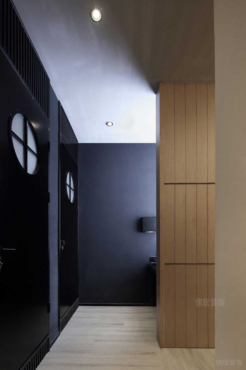 干濕分離的衛生間,配色上選用高級黑,定制的門上點綴簡單的造型,兼具質感與時髦感。