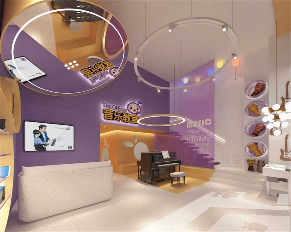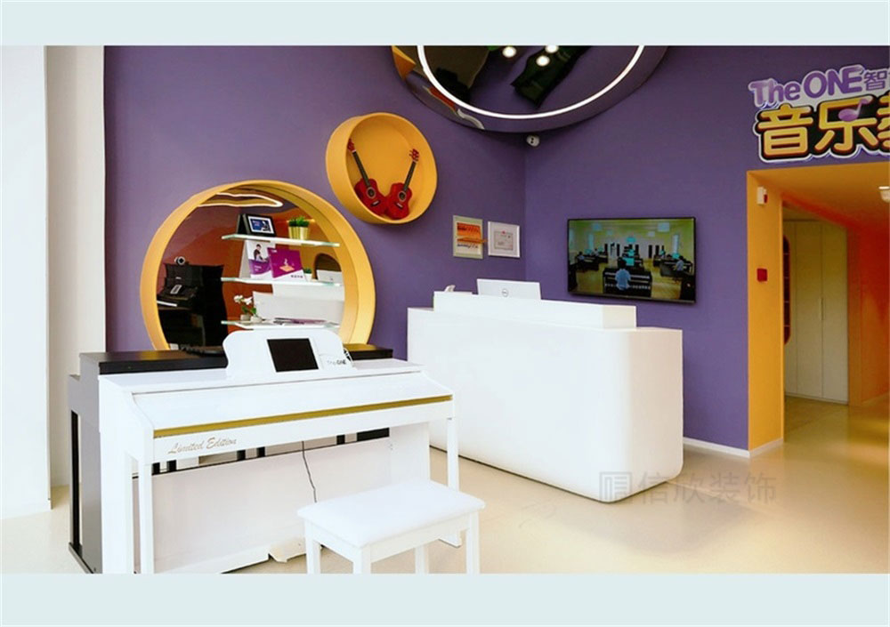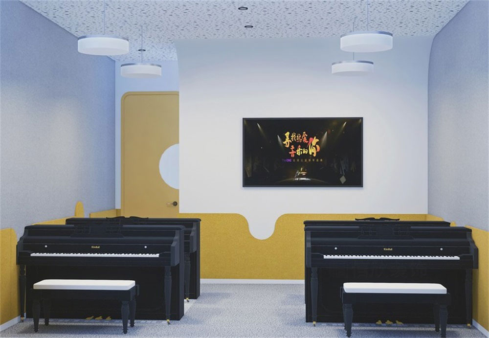 灰白色為主題的鋼琴教室,橙色為點(diǎn)綴,配合弧形的吊頂,既保留了音樂殿堂的嚴(yán)肅莊重的氣氛,又體現(xiàn)了超脫和跳躍,不拘一格的設(shè)計(jì)感。