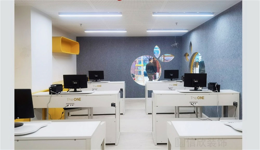 灰白色調(diào)為主題的大課室裝修設(shè)計(jì),顏色簡單明了,個(gè)性鮮明,墻體的黃色造型和置物架;讓人在沉悶的學(xué)習(xí)中,注入了夏天的活力。