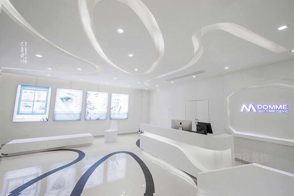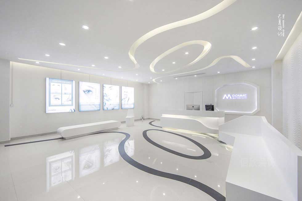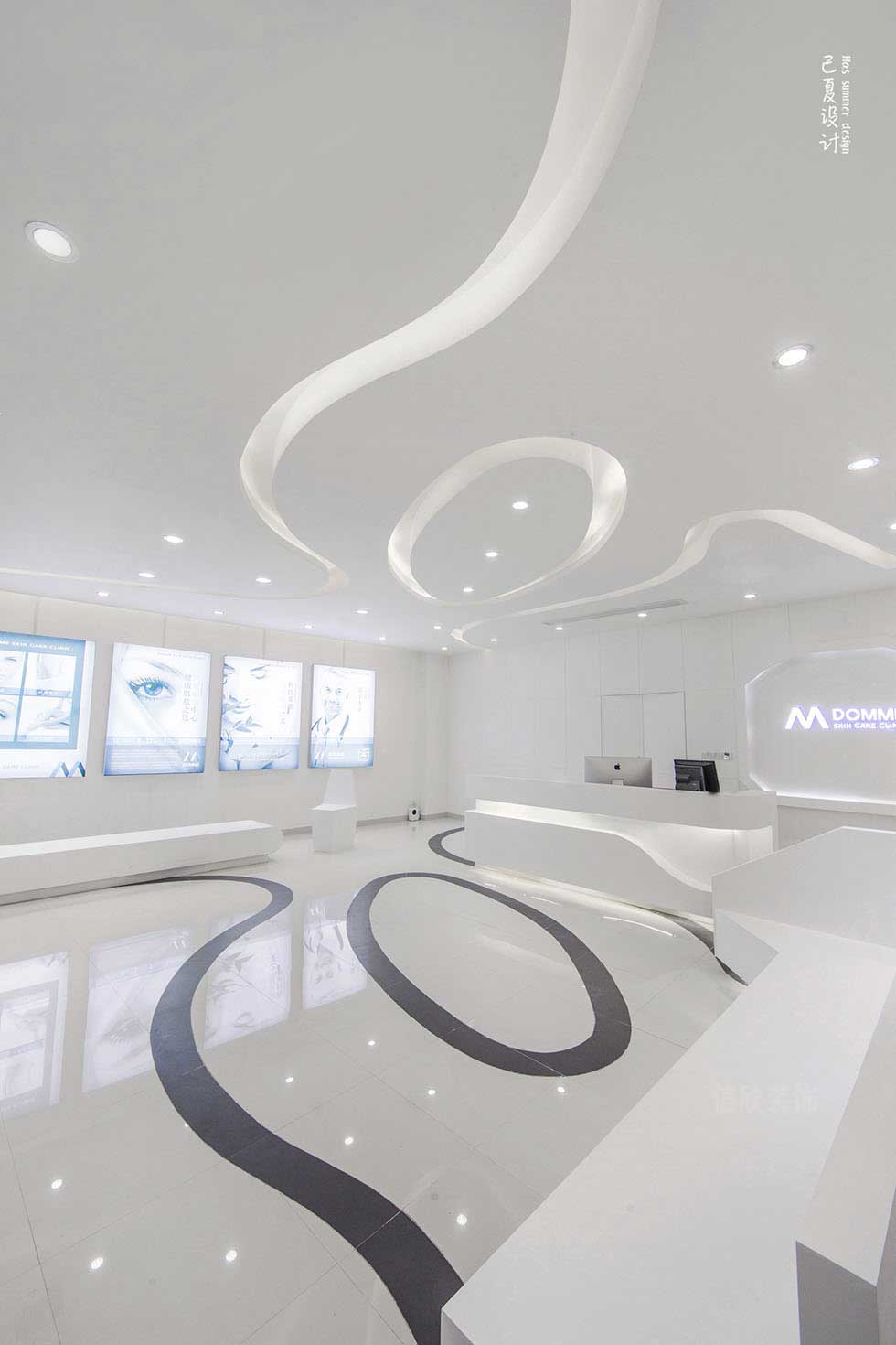 純白色的大廳,寬敞通透,明亮開闊,頂面的燈膜和地面的曲線像呼應的設計,線條感強烈,立體而生動,波浪紋的前臺背景墻,通過靈動的線條感,創作出極簡風的時尚美感。