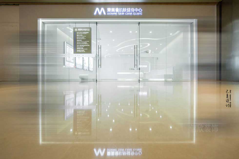 過道大面積的白色的墻面應用,在暖白地磚的色彩對比下,顯得更白空間更通透直接,盡頭放上品牌的LOGO ,可以更加醒目和吸引眼球,讓客戶一眼看上去就有素雅高端的感覺。