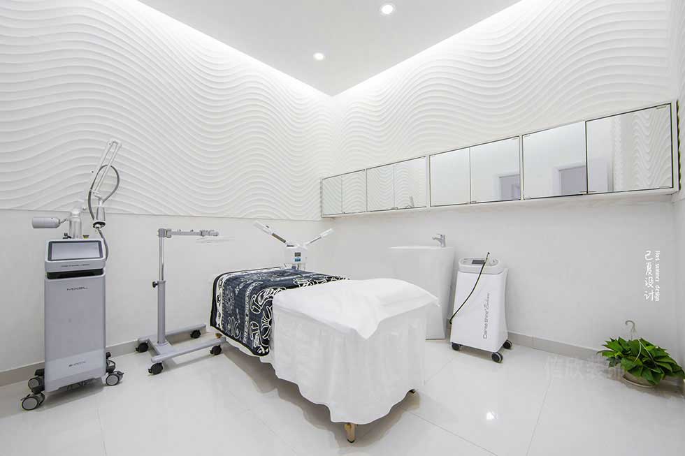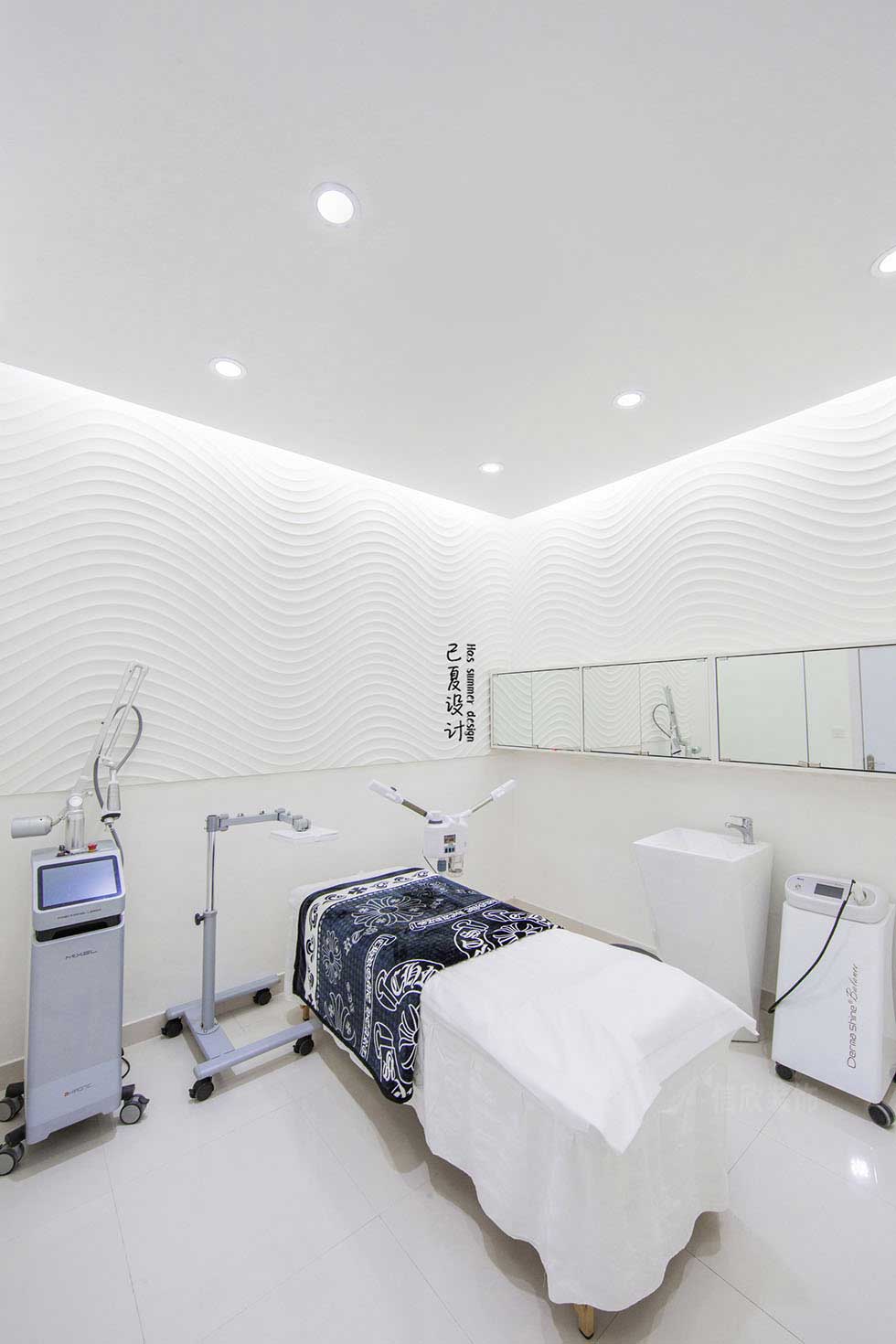 美容室的裝修設計,采取了和大廳相同的白色調極簡風,簡約的頂面,外擴式的燈條加以提亮,同時沿用波浪紋的半墻設計,有線條的立體美感,但是又不會覺得花哨。