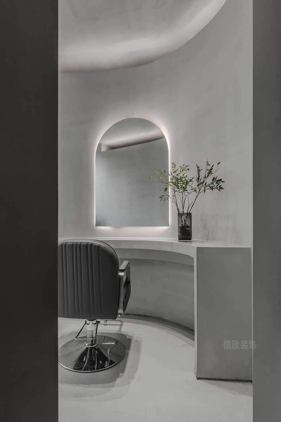 設計再次展現了自然與室內的無邊之界,漫長的造型時間難免枯燥無聊,巧妙的設計恰好可以為時光增添生趣。弧線形的操作臺讓每位客人都暢通無阻地欣賞到戶外風景。在等待的間隙給眼睛放個假,也為心靈安排了一段愜意的旅行。