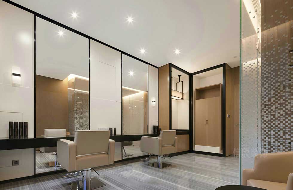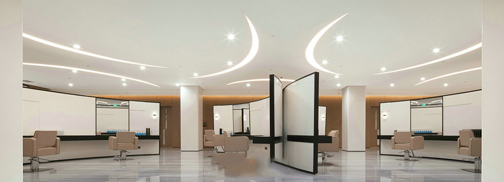 四層的護墻板,看上去層次感非常強,通過燈光的打磨,檔次得到提升,LED顯示屏的背景墻,不僅走在時代前沿,同時兼具科技感和營銷的作用,步入美發廳就可以看到企業文化的宣傳。