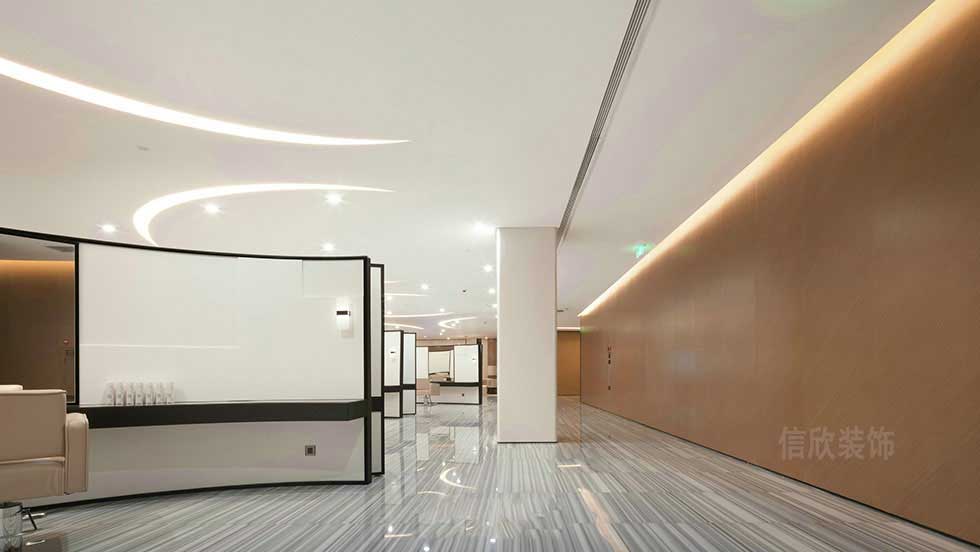 前臺的裝飾設計,運用了弧形的表達方式,圓弧形的金屬前臺和墻面墻面相呼應,時尚現代,同時穿透力強烈,極具設計美感。