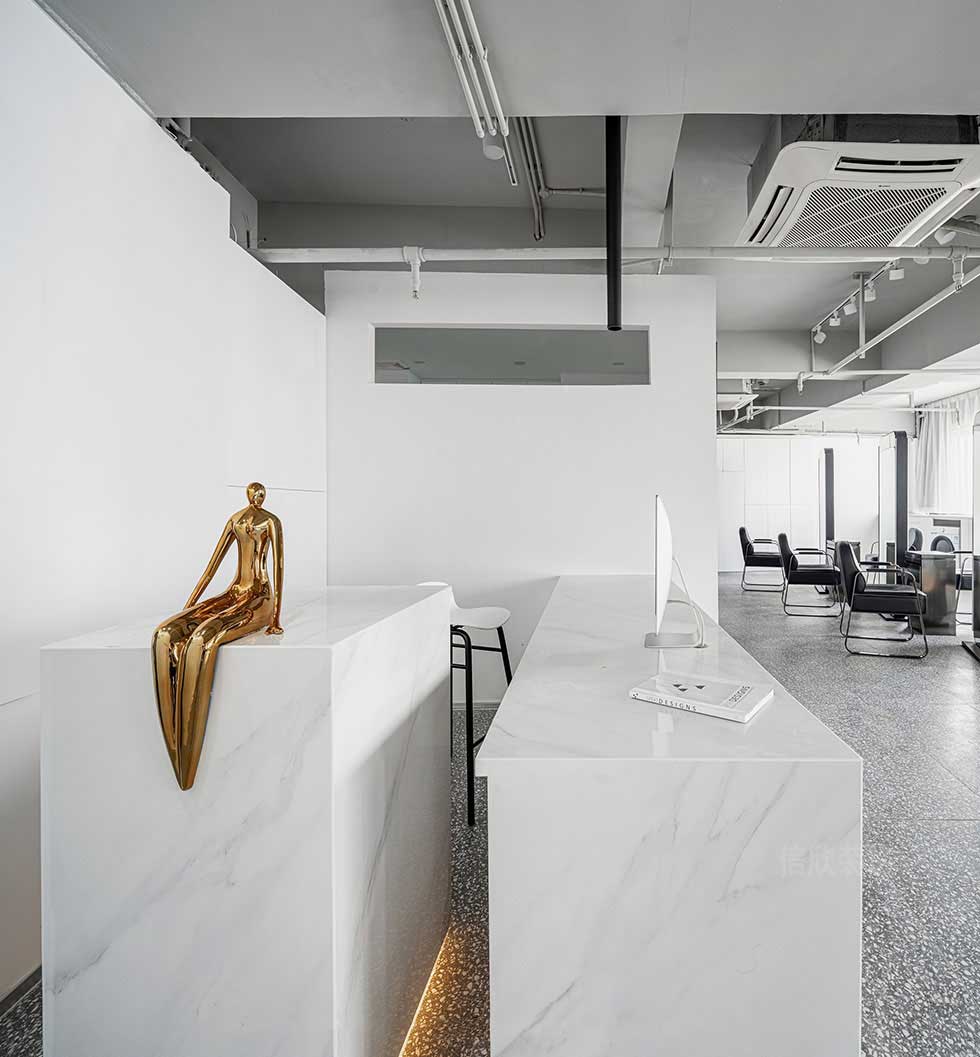前臺和內(nèi)部空間做了一個(gè)區(qū)分和間隔,增加一些背部的神秘感,和空間引入的一個(gè)效果,白色的前臺用立體效果的背景墻,白色大理石紋理和燈條的設(shè)置,簡單中卻不平庸,富有高雅的質(zhì)感。