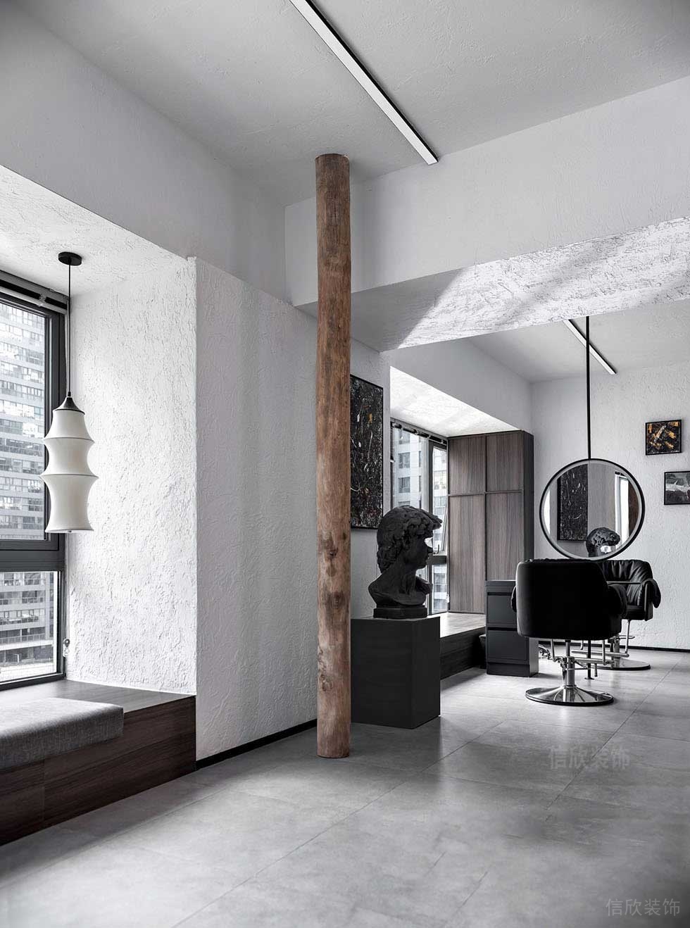 入戶區域的設計做了一個空間的引入,通過砂礫和黑色背景墻和柱子等元素的表達方式,達到一個既有設計感,又富含藝術氣息的形式,打開人們的好奇心。