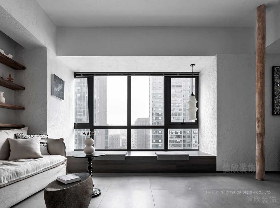 依窗而建的小洽談區,置物板的北歐元素和布藝沙發,光線明媚充足,通過顏色對比的方式,由淺而深的逐層遞進,使空間的色彩應用更富有層次感。