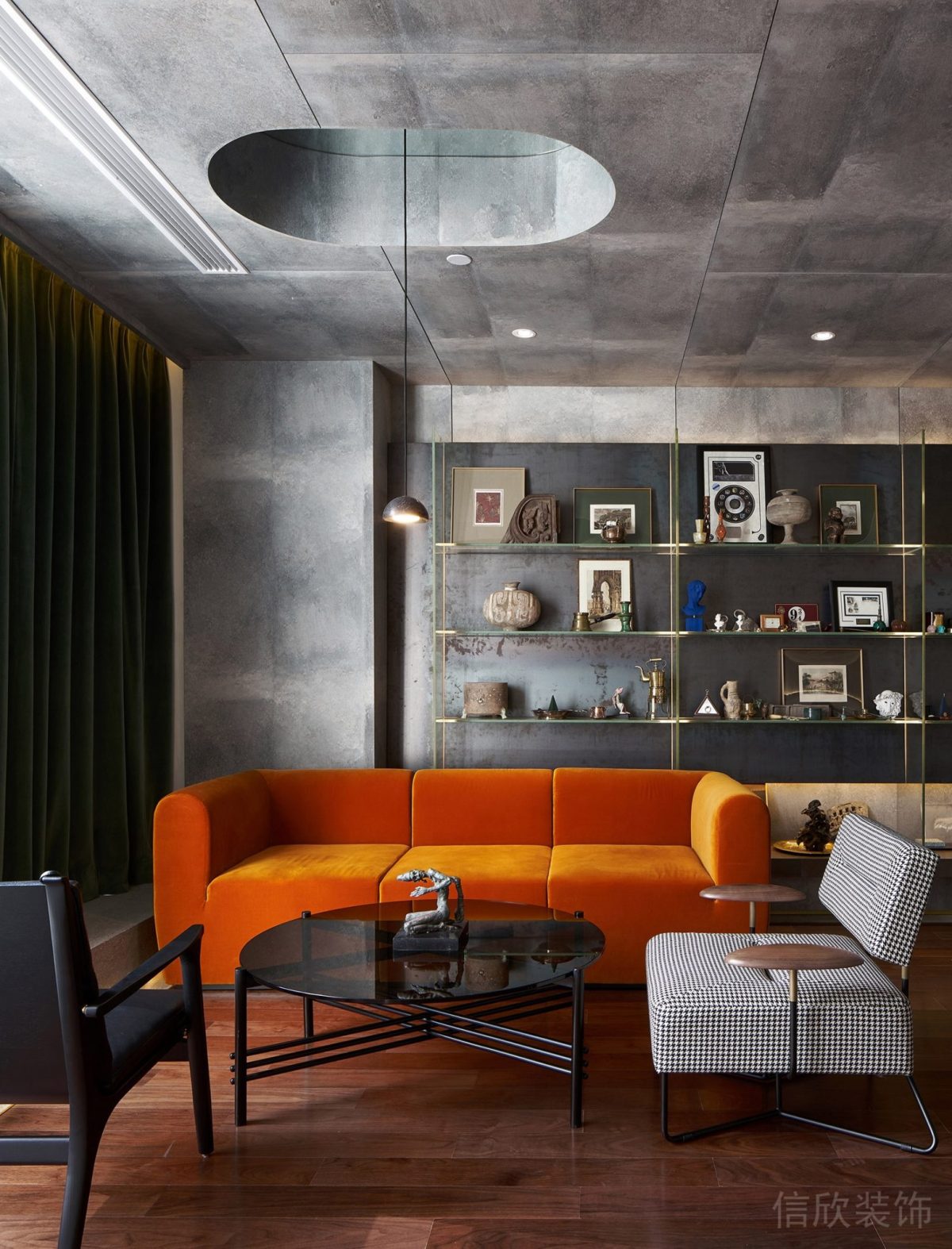 茶水休閑室中心區域擺置的天然老木大班臺成為了空間的視覺焦點,呈現出典雅大氣的場域面貌。