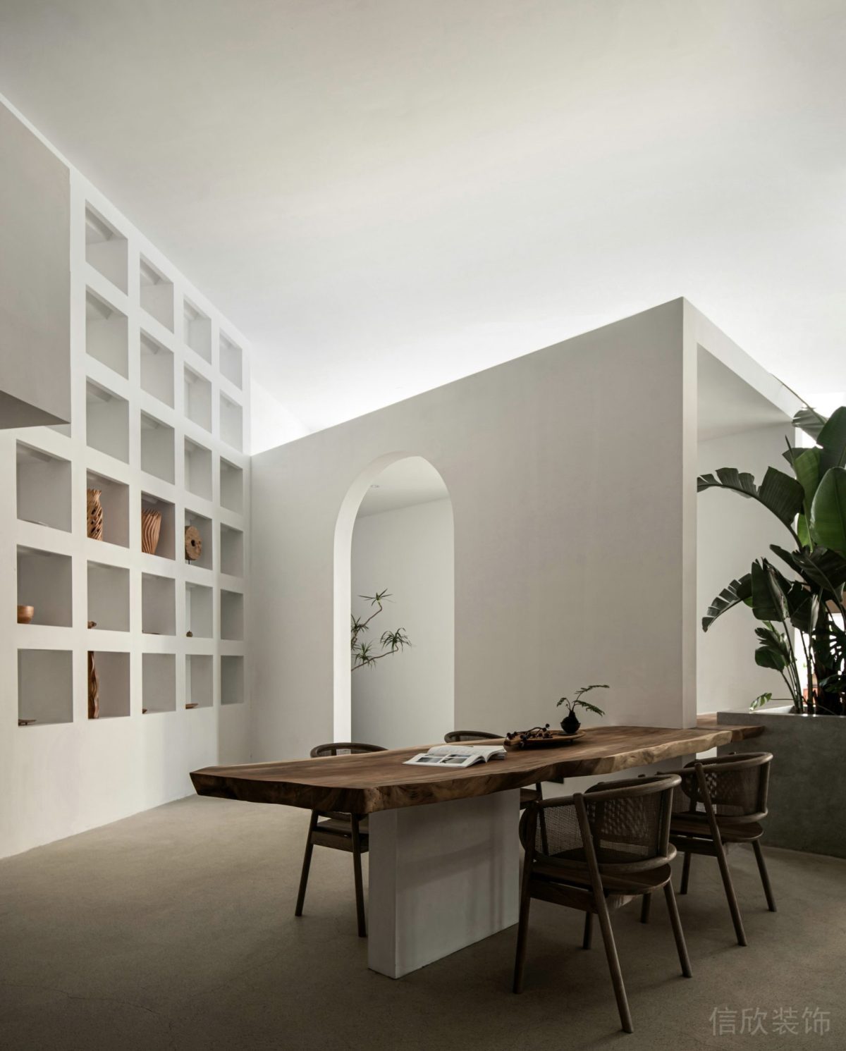 展現多人工位的開放式設計,搭配綠色植被和水磨石地板的效果圖。