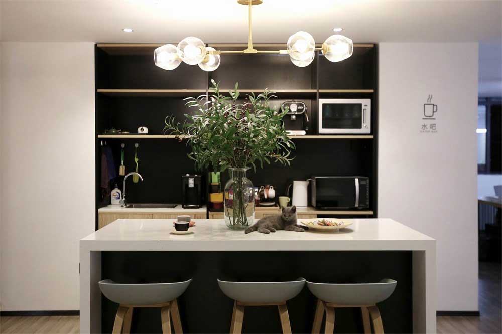 天然的大理石吧臺,原木色的高腳椅,杏黃色的木地板,更具古樸的色彩。