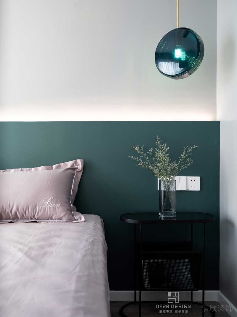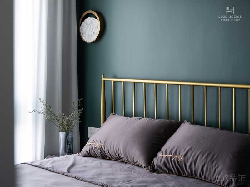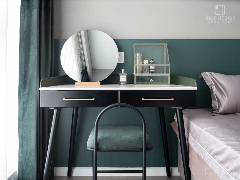 次臥整面墻的綠色背景,讓人一走進來,看見這一抹養眼的綠意,就能讓人沉浸在此刻這種溫馨的氣息中,香檳金的床和梳妝臺設計元素,夢幻般紫色的床單和被子,簡單輕奢,而又不失格調的感覺。