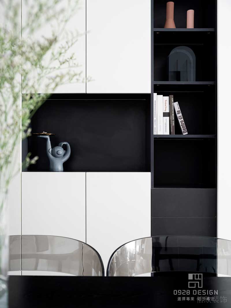 黑白兩色經典搭配的鞋柜,黑色和白色的插色,美觀大方,色彩跳躍感強,打破沉悶,黑色實木的餐桌,在香檳金的吊燈下,紋理豐富,造型前衛,有一種后現代主義的現代摩登感。