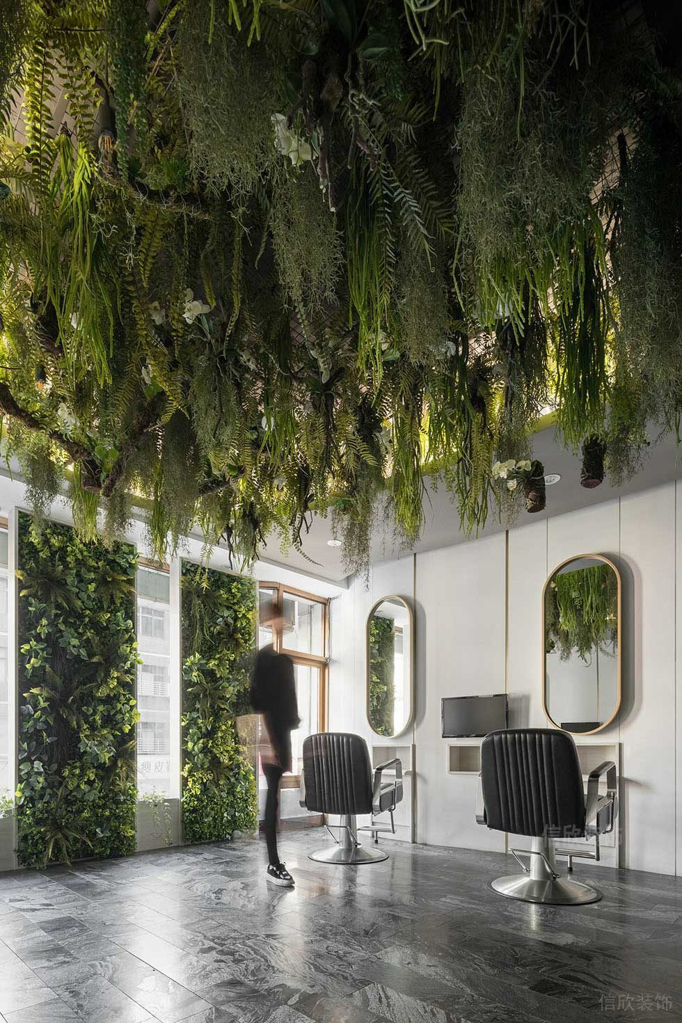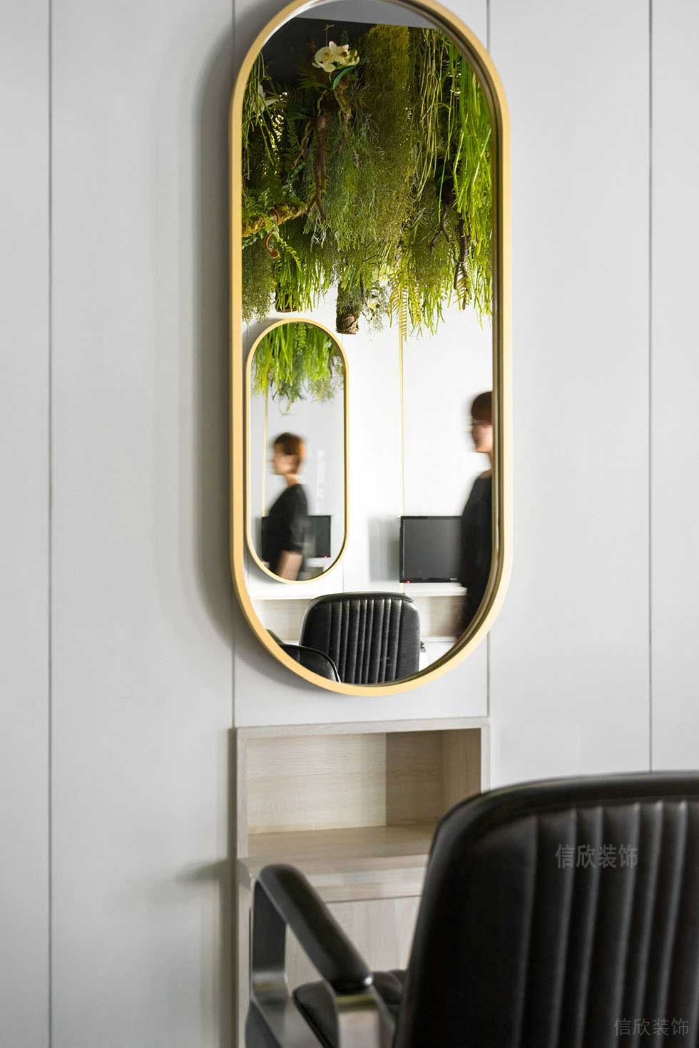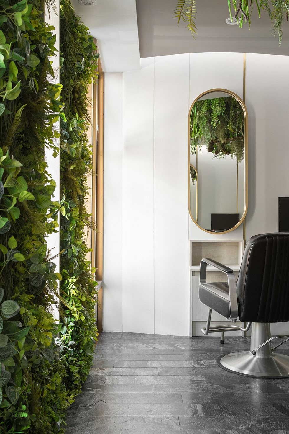 造型區(qū)的設(shè)計(jì),采用直通式 的處理手法,頂部是下垂的綠植,給人的感覺比較自然和清新,而在一個(gè)個(gè)金屬邊框小鏡面的反射下,空間的立體感又能得到很好的提升效果。