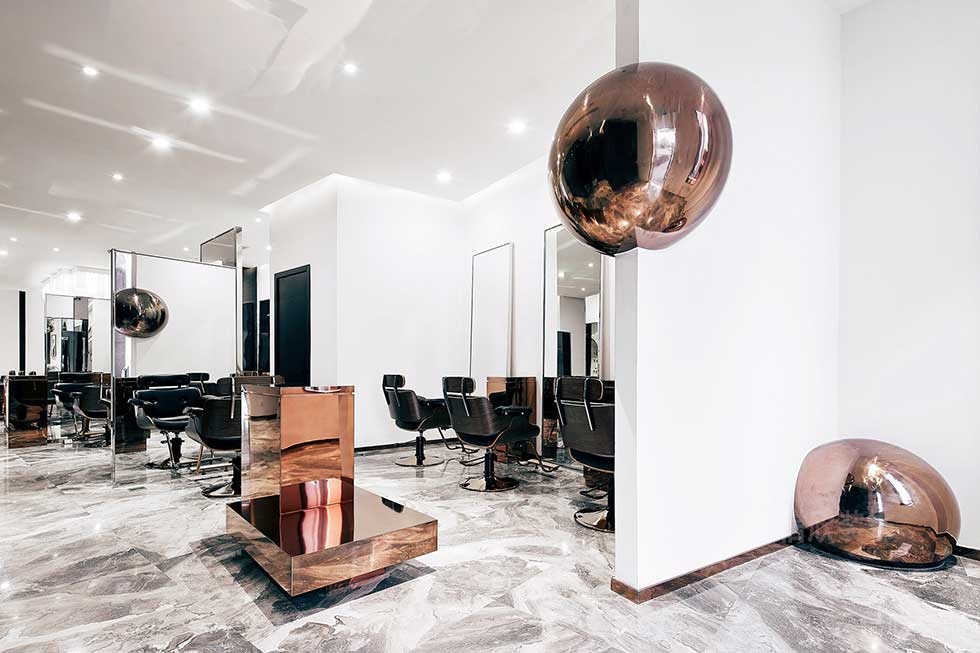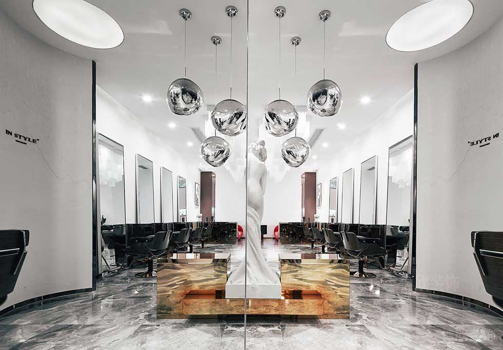 ▼理發(fā)區(qū)概覽,雕像裝置為美發(fā)空間注入靈動(dòng)的藝術(shù)氣息