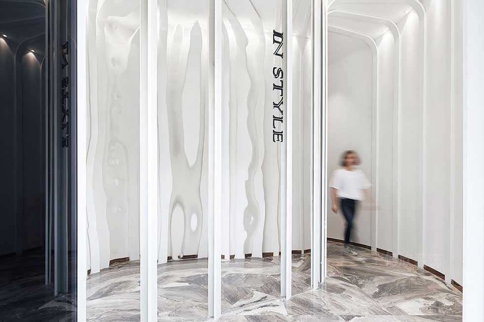圓弧曲徑廊道是連接室內(nèi)外的過渡地帶,也是提供給顧客留影的場(chǎng)景之一。凹凸不平的鏡面是設(shè)計(jì)師埋下的荒誕趣怪的種子,放大或縮小,妙趣橫生。條形界面刻畫出廊道的秩序感,將人的視覺層層推進(jìn),引領(lǐng)顧客抵達(dá)隱藏在入口背面的前臺(tái)位置。圓形元素進(jìn)一步被運(yùn)用,玫瑰金屬材質(zhì)和地面的文化石賦予空間更鮮明的屬性:時(shí)髦而優(yōu)雅。