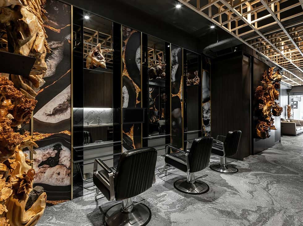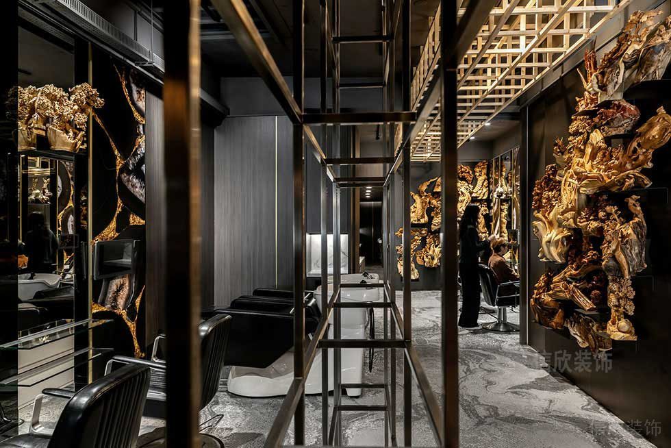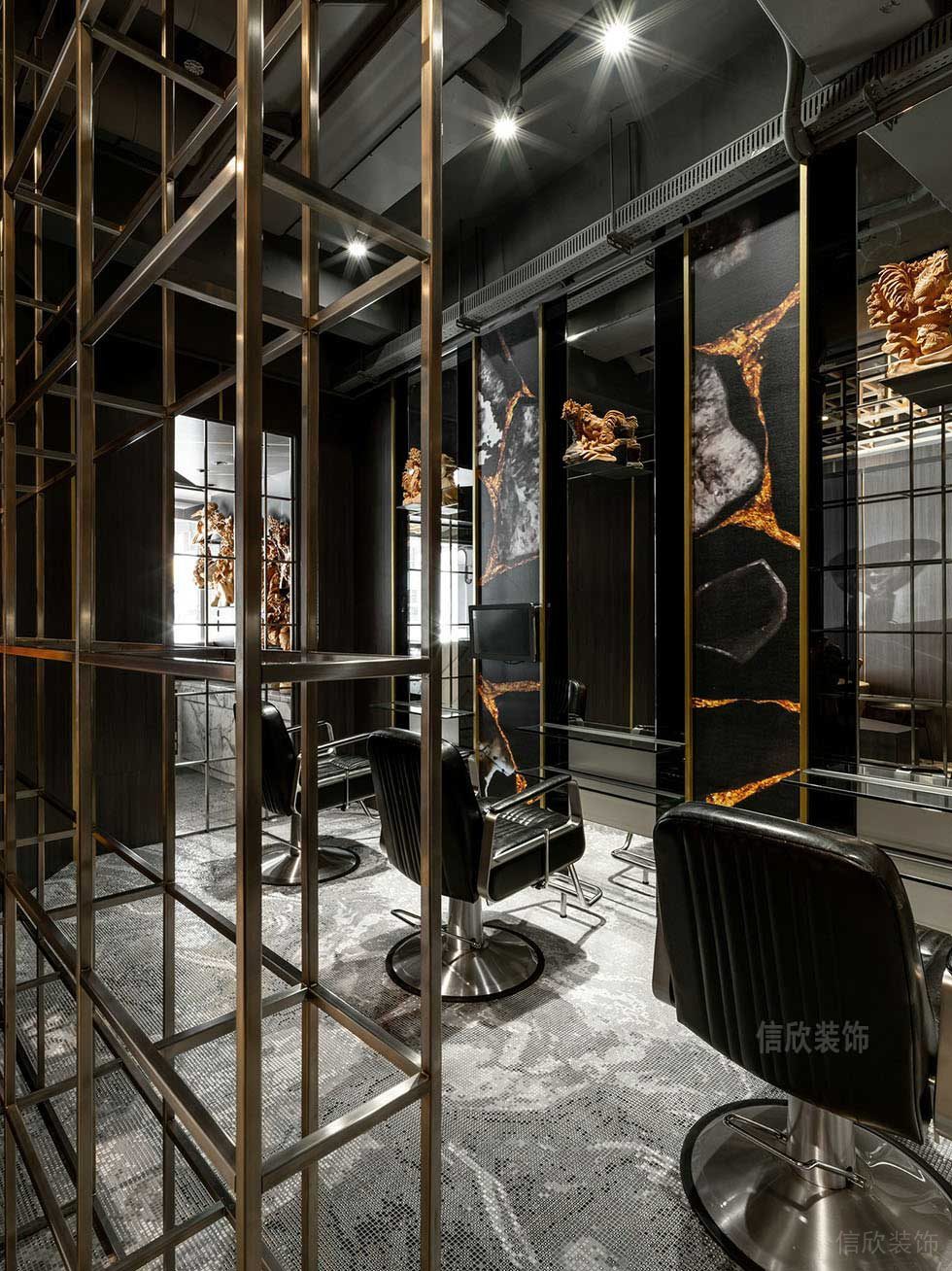 洗頭區(qū)和造型區(qū)放在同一片區(qū)域,可以使整體看起來更完整和和諧,同時相互又不會干擾,在金色和黑色兩者色調(diào)的搭配下,簡單中也能體現(xiàn)出潮流和設(shè)計感的完美組合效果。