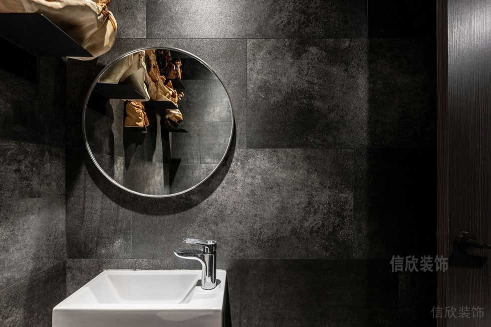 頂面原始的頂面噴黑,選擇用木龍骨架把過道和造型區(qū)分開,降低了層高的方式顯得更溫馨,線條感更強(qiáng)烈,內(nèi)部刻意裸露的線管和射燈,在光影作用下,黑色的質(zhì)感更能得到體現(xiàn)。