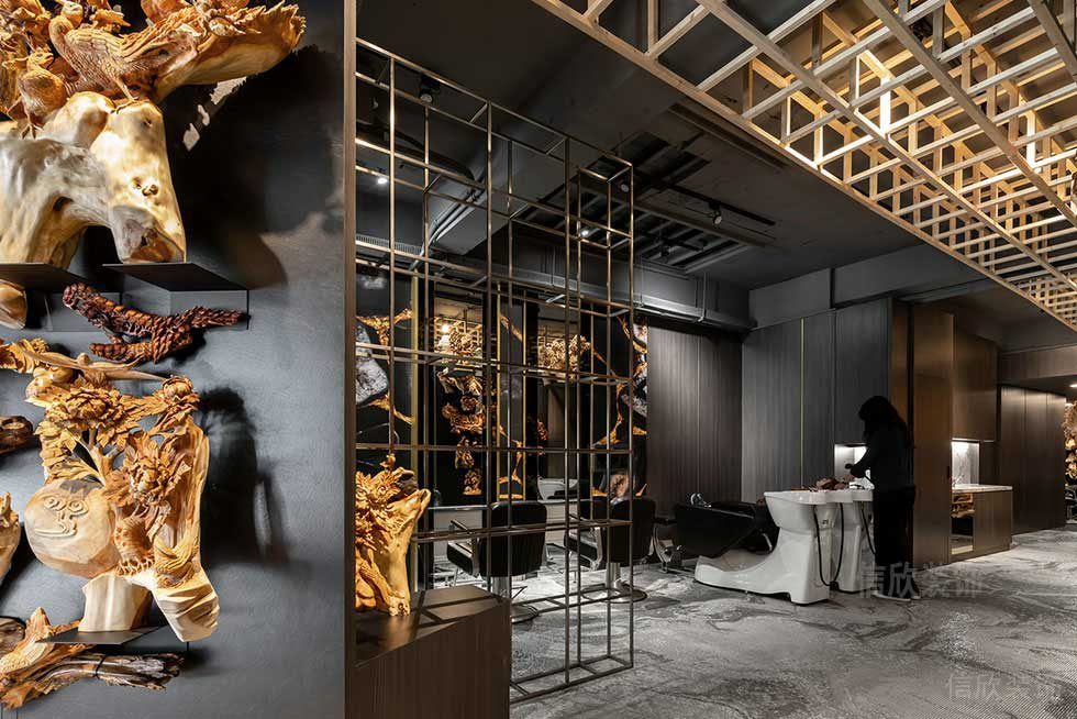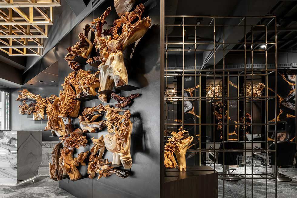 設(shè)計理念:本案是一所創(chuàng)意型風(fēng)格的高端美容美發(fā)店裝修設(shè)計案例,美容美發(fā)店入戶的裝修設(shè)計,采用極具創(chuàng)意的根雕藝術(shù)作為背景墻,斜角的處理方式起到了隔斷的作用,也能使整個入戶區(qū)空間感更開闊,有效的區(qū)分了造型區(qū)和外立面大廳。以創(chuàng)意為主,沒有拘束,造型上追求簡潔,材料簡單,突出個性特征。在造型上,能夠獨一無二。一般來說,設(shè)計師會用幾何圖案,作為塑造整體的設(shè)計元素。適合藝術(shù)、工藝品、品牌公司。造型簡潔,用料簡單,強(qiáng)調(diào)原創(chuàng)的特征,盡量不重復(fù),在造型上具有唯一性。