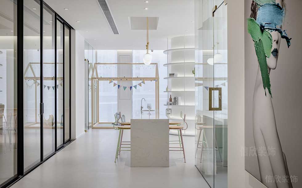 中島臺代替傳統前臺的設計方式,多了一份創意和休閑的感覺,讓客戶一進來似乎感覺是來喝咖啡,朋友聚會一樣,拉進彼此之間的距離,消除隔閡,快速走進客戶的心里。