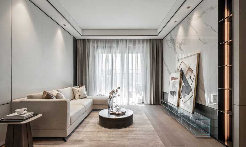 客廳開放式的設計,無主燈無燈帶的處理方式,通鋪式的周邊頂,經久耐看,拋棄了繁復的設計,尋求心靈上的平靜,大理石通鋪的電視背景墻和地臺,美觀大方,紋理豐富不占空間且方便打理。