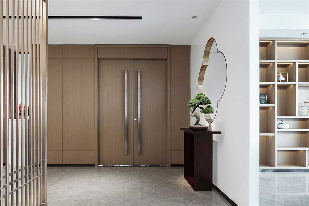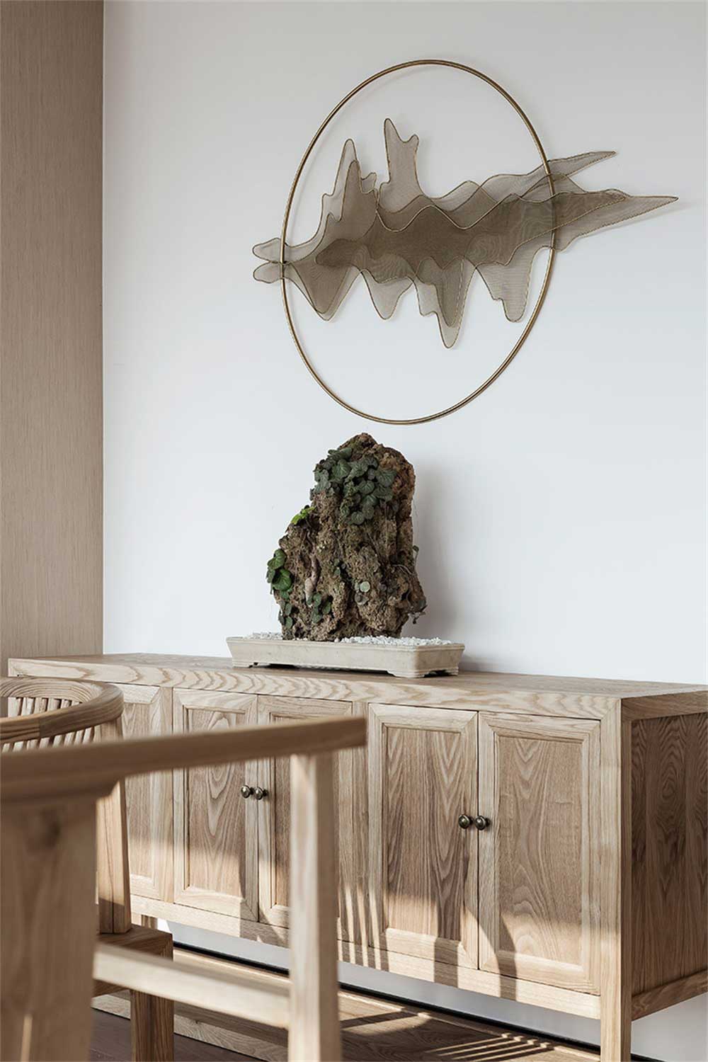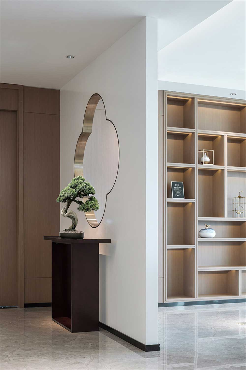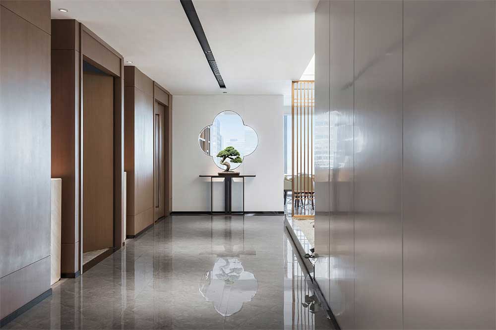 前廳空間以灰色大理石地面,白色大理石背景墻,淺色木紋的護(hù)墻板,平頂和周邊頂相結(jié)合,木材與石材結(jié)合的前臺等元素,構(gòu)建出一個簡單大氣,又儒雅內(nèi)斂的新中式主義前廳設(shè)計,兼具了美感與實用性。入戶的過道,采用木紋護(hù)墻板和門一體式的設(shè)計看起來風(fēng)格更統(tǒng)一,室內(nèi)的枯山水景觀,鏤空式的墻體的玄關(guān)柜則體現(xiàn)中式古典文化的內(nèi)涵。會議室和吧臺區(qū),以護(hù)墻板穿插中式山水畫的巧妙點綴,讓空間更飽滿,更有古風(fēng)的氣息。辦公室以長條形的實木和平頂?shù)慕Y(jié)合,使延伸感更強。洽談區(qū)選擇在落地式窗戶的前臺,擺放上實木的家具和泡茶桌,采光和采景效果最好,一邊喝茶一邊欣賞美景,符合了唐詩中“會當(dāng)凌絕頂,一覽眾山小”的豪邁氣勢。